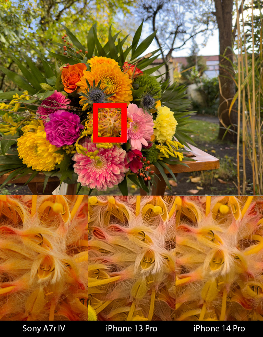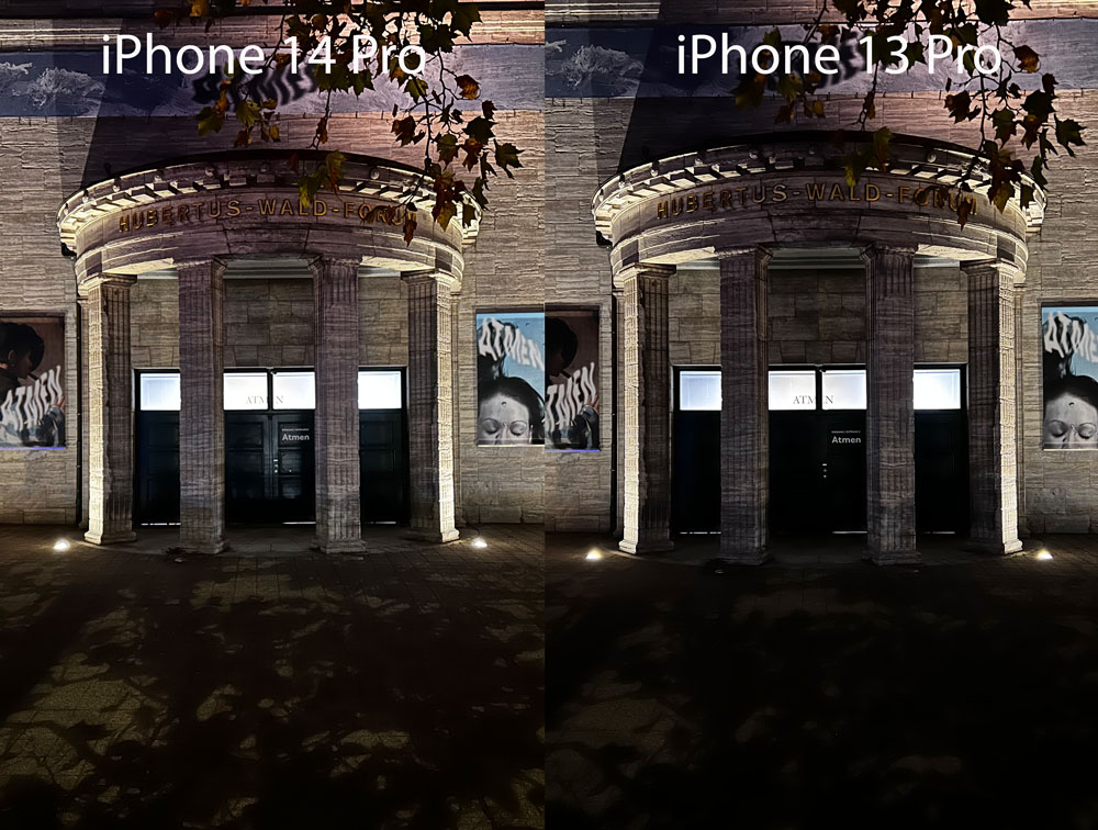 Der Vergleich zeigt die Entwicklung: Als Referenz haben wir eine Sony A7r IV gewählt. Die Unterschiede der beiden iPhones treten mehr als deutlich hervor. Das neue liefert mehr Details und muss daher weniger aggressiv schärfen. Mehr noch: Man kommt nicht umhin festzustellen, dass das neue iPhone 14 in dieser Disziplin die Qualitätserwartungen an ein Fototelefon in eine neue Dimension verschiebt.