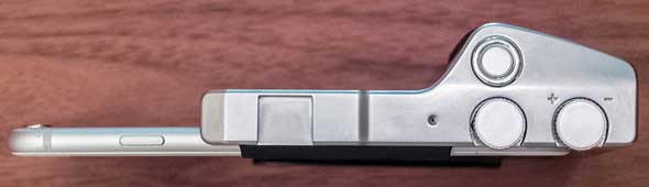 Auf der Unterseite hat der Griff ein Stativgewinde – leider liegt es an der rechten Seite und damit nicht unter dem Kameramodul, weshalb es nicht so einfach wäre, das iPhone für Panoramaaufnahmen um seinen parallaxfreien Drehpunkt zu drehen. Auf seiner Oberseite kann ein standardisierter Zubehörschuh diverse Extras aufnehmen; er hat aber keinen Mittenkontakt für die Blitzsynchronisation.