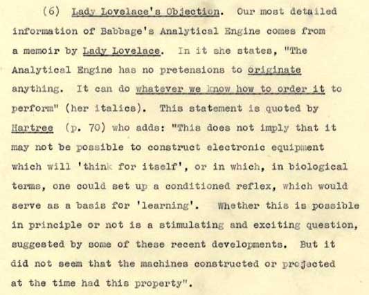 Das Gegenargument der fehlenden Kreativität und Originalität ist noch viel älter; es geht auf Augusta Ada Byron King, Countess of Lovelace (1815–1852) zurück, eine Mitarbeiterin des Mathematikers Charles Babbage (1791–1871), der mit seiner Analytical Engine den ersten universellen Computer erfunden hatte. Dieser mechanische Computer erwies sich als zu komplex, als dass er sich mit der damaligen Technik bauen ließ, aber Lady Lovelace beschäftigte sich bereits mit den nötigen Konzepten, um die Maschine für verschiedene – nicht nur mathematische – Aufgaben zu programmieren. Mangels eines funktionsfähigen Computers blieben ihre Überlegungen Theorie, aber sie war seinerzeit wohl die Einzige, die in diesem Zusammenhang wusste, wovon sie redete. Lady Lovelace schrieb: