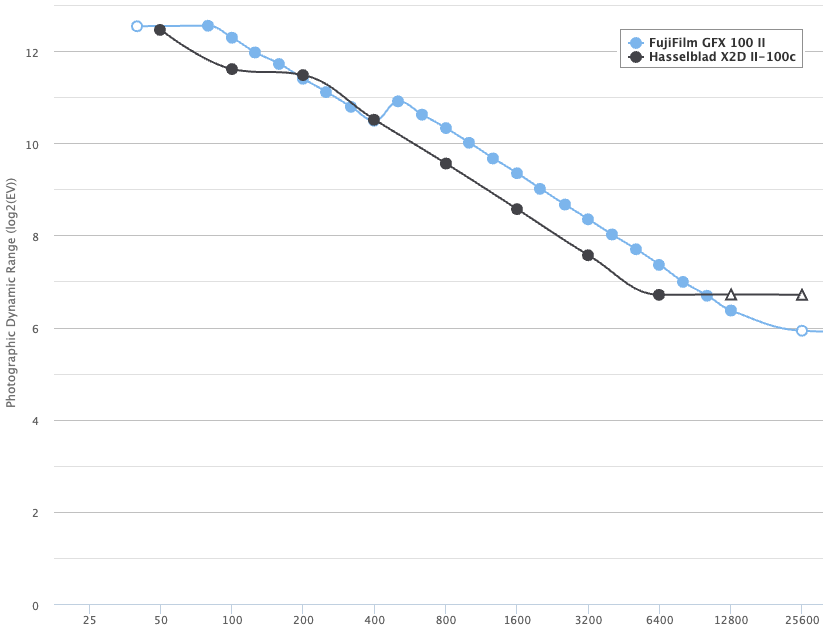 Wie man sieht, liegt die schwarze Kurve der X2D II 100C nur bei ISO 200 und 400 etwa gleichauf mit der blauen Kurve der GFX100 II, während sie bei den übrigen ISO-Einstellungen um gut 2/3 EV unter der des Fuji-Modells verläuft. Bei ISO 50 liegt die X2D II 100C noch ein wenig unter dem Wert der GFX100 II bei ISO 100. Die von Hasselblad beworbenen 15,3 EV werden klar verfehlt: Die Messung des „Photographic Dynamic Range“ ergibt ein Maximum von realistischeren 12,5 EV bei ISO 50. Nun gibt es verschiedene Arten, den Dynamikumfang zu definieren und zu messen, und es mag durchaus sein, dass die X2D II 100C nach irgendeiner Definition tatsächlich 15,3 EV erreicht. Diese Werbeaussage ist allerdings wenig wert, weil wir nicht wissen, welches Ergebnis die Produkte der Mitbewerber mit demselben Messverfahren erreichen würden – gut möglich, dass es noch höher wäre.