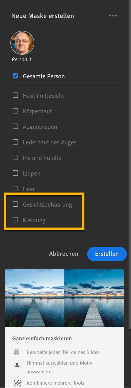 Sowohl in Lightroom Classic als auch in Lightroom (Mobile/Cloud) gibt es nun wie bereits zuvor in Camera Raw bei den selektiven Korrekturen (Masken) eine »Gradationskurve«. Ein Segen für fortgeschrittene Anwender, da dieses Tool präzise selektive Farb- und Kontrastkorrekturen ermöglicht. Bei den Personen-KI-Masken werden jetzt zusätzliche Bereiche wie Kleidung und Bärte erkannt und es gibt dafür auch neue adaptive Presets.