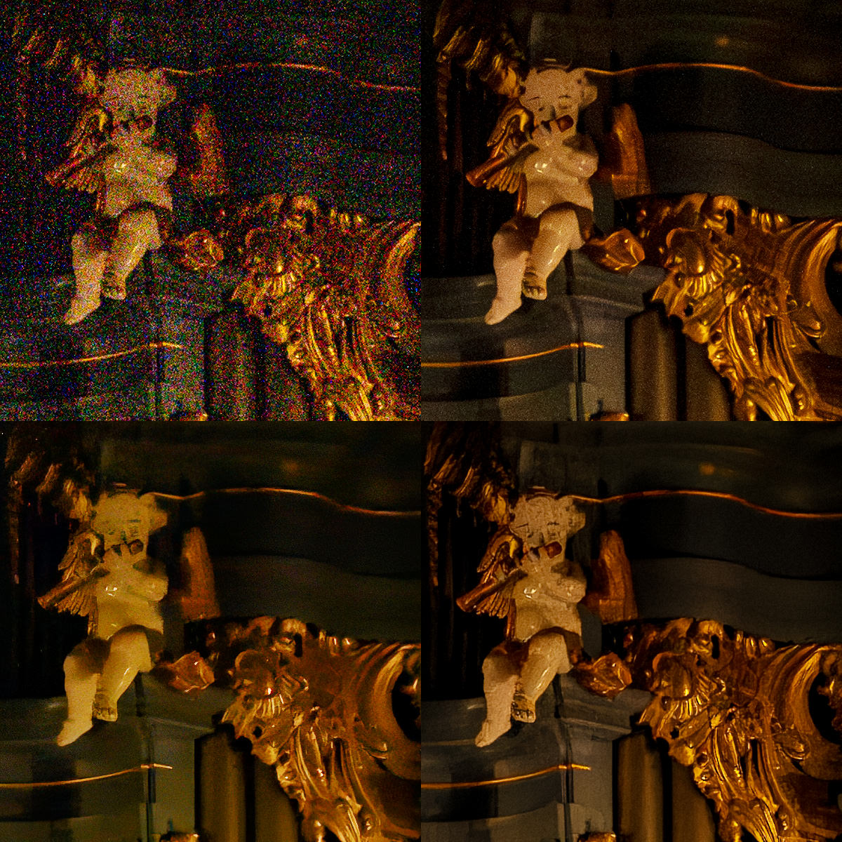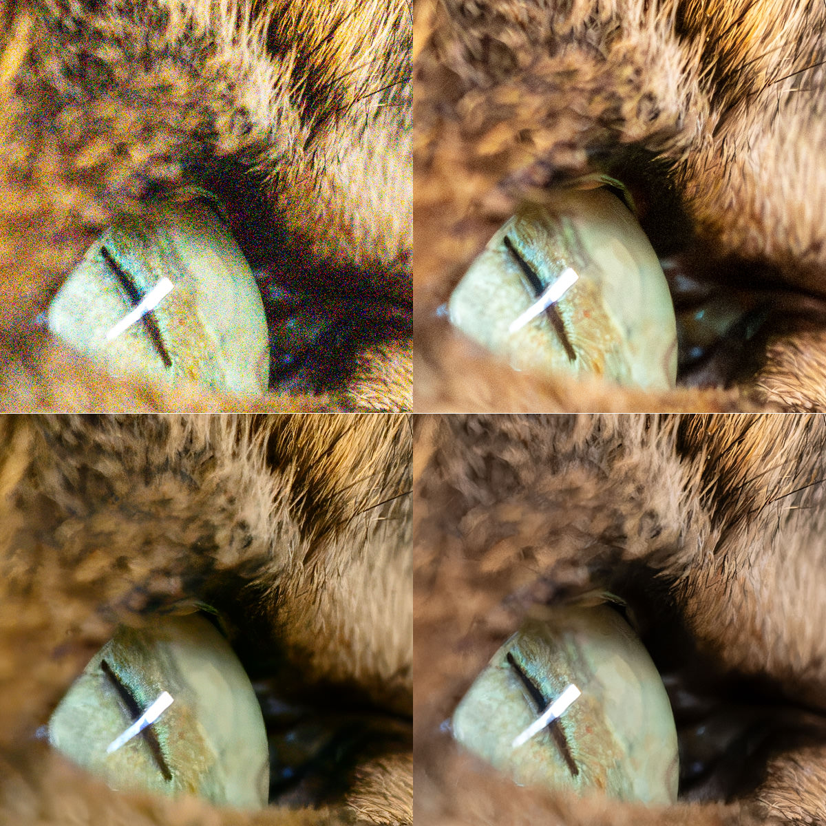 Um die Fragen zu beantworten: Oben links ist jeweils das Original, rechts davon die Adobe-Entrauschung, unten links Topaz Photo AI und daneben DxO PureRaw 3 (mit DeepPrime XD).
