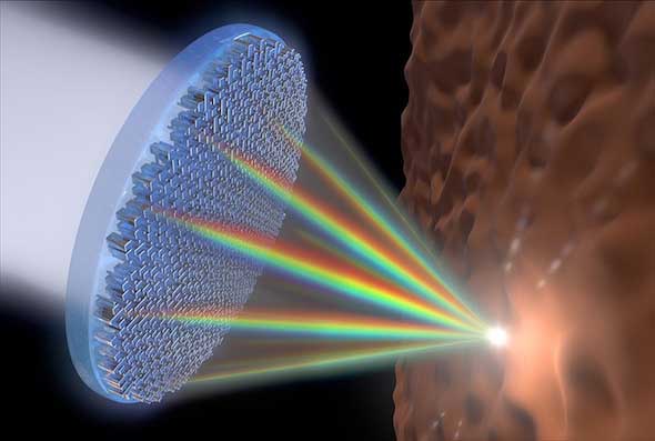 Vor einigen Jahren gelang das nur mit den längeren Mikrowellen oder im Bereich des Infrarot, aber mittlerweile ist es gelungen, Metamaterialien mit so kleinen Strukturen zu erzeugen, dass sich so hergestellte Linsen auch für das sichtbare Licht zwischen etwa 400 und 700 Nanometer eignen. Die Linsen lassen sich aus einem preisgünstigen Basismaterial wie Titandioxid herstellen, mit lithografischen Verfahren, wie sie auch in der Chip-Produktion eingesetzt werden.