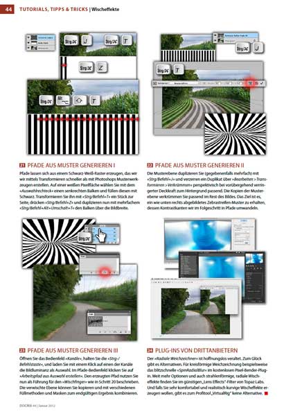 Das Funktionsprinzip der Aktion ist übrigens, dass aus der Helligkeitsinformation eines Bildes automatisch Pfade generiert werden, an denen Photoshop-Werkzeuge mit deren Pinselspitzen entlang geführt werden. Neu ist diese ziemlich geniale Idee nicht. Die hatten Doc Baumann und ich zum Beispiel schon vor sieben Jahren in DOCMA 44 (erschienen in 2011) beschrieben, um etwa eine Weichzeichnung um die Kurve zu erzeugen, für die es damals nur sauteure Plug-ins gab und die inzwischen mit der »Pfad-Weichzeichnung« in Photoshop deutlich einfacher und mit besserer Qualität zu erzielen ist. Die hier empfohlene Aktion ist vergleichsweise deutlich aufwendiger und beinhaltet zudem einige für das Ergebnis optimierte Pinselspitzen-Vorgaben.
