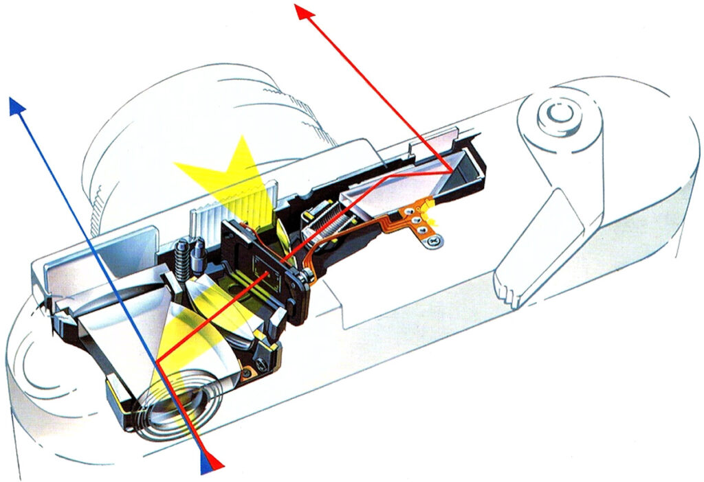 Das elektronische Sucherbild nutzte Leica auch für die Weiterentwicklung des Messsuchers. Gegenüber dem in der M9 verbauten Sucher wurde er bis heute zweimal runderneuert, damit seine Genauigkeit der elektronischen Alternative nicht nachstand und auch der mittlerweile auf 60 Megapixel gestiegenen Sensorauflösung gerecht wurde. Seit der M (Typ 240) muss er im Werk und vom Kundendienst nicht mehr aufwendig per Hand kalibriert werden; stattdessen wird das Live-View-Bild als Referenz genutzt und der Messsucher auf dieser Basis automatisch justiert (was aber immer noch dem Kundendienst überlassen werden sollte).