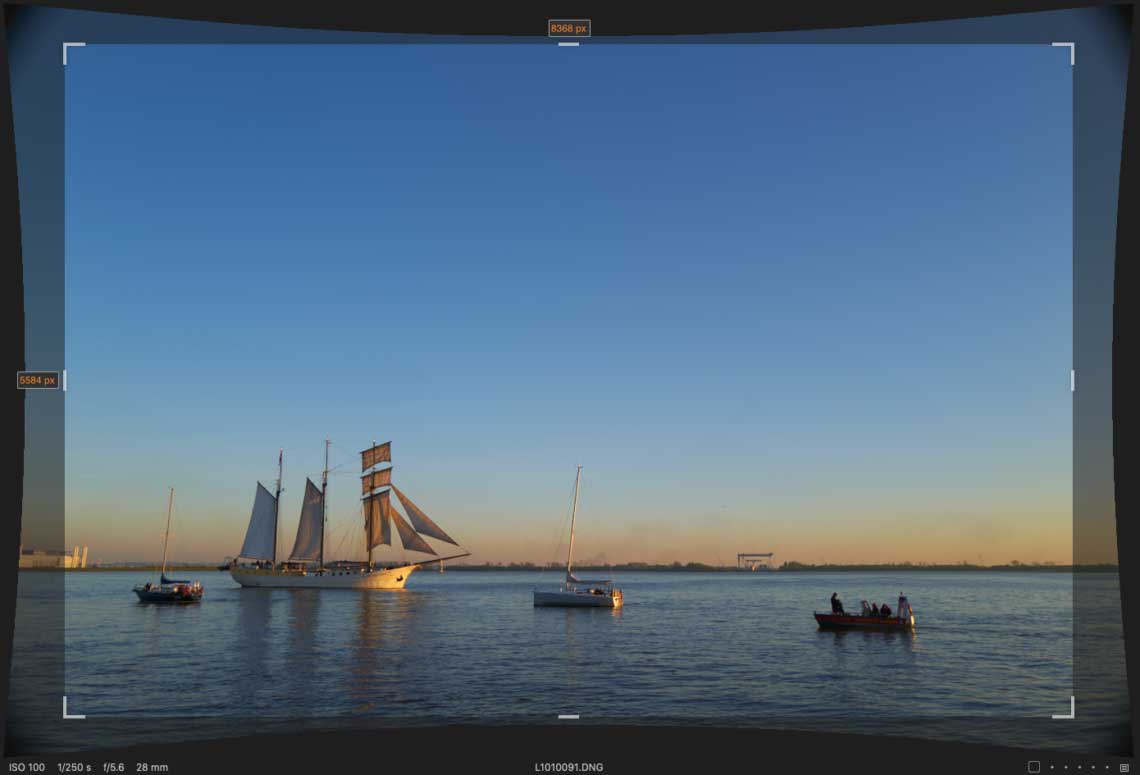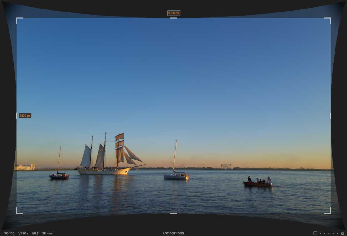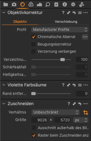 Im Zuge der Verzeichnungskorrektur wird das Bild aber gleichzeitig größer, denn würde man das größtmögliche Rechteck ausschneiden, wäre dieses, wie oben gesagt, 9026 mal 5720 Pixel groß. Tatsächlich beschneidet Capture One aber im Normalfall stärker, so dass nur noch die nominellen 8368 mal 5584 Pixel übrig bleiben. Der Sinn der Sache ist wohl, die geringe verbliebene Vignettierung abzuschneiden; vielleicht genügen die Randpixel auch nicht Leicas Ansprüchen an die Bildschärfe. Lightroom tut dasselbe, nur zeigt es weder die zur Korrektur aus dem Rahmen gezogenen Pixel an, noch lässt es eine Wahl bei der Anwendung des Korrekturprofils: Lightroom wendet zwangsweise die eingebettete Korrektur an.