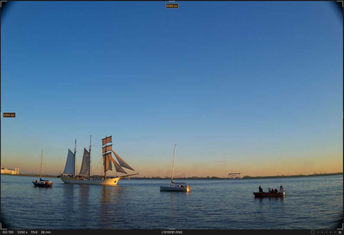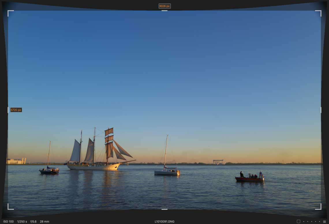 Aber vielleicht sind die Extra-Megapixel ja ein Artefakt der Objektivkorrektur? In DNG-Dateien der Q2 sind zwei Serien von „Opcodes“ für Bildkorrekturen eingebettet. Die eine dient der Entfernung defekter Pixel und wirkt sich auf die Bildgröße nicht aus, aber die zweite korrigiert die tonnenförmige Verzeichnung des 28-mm-Objektivs. Der Effekt ist in Capture One gut zu sehen, wenn man die Option »Verzerrung verbergen« abschaltet, wie ich es auch bei den hier gezeigten Beispiel-Screenshots getan habe: Die Bildecken werden zur Verzeichnungskorrektur nach außen gezogen und abgeschnitten.