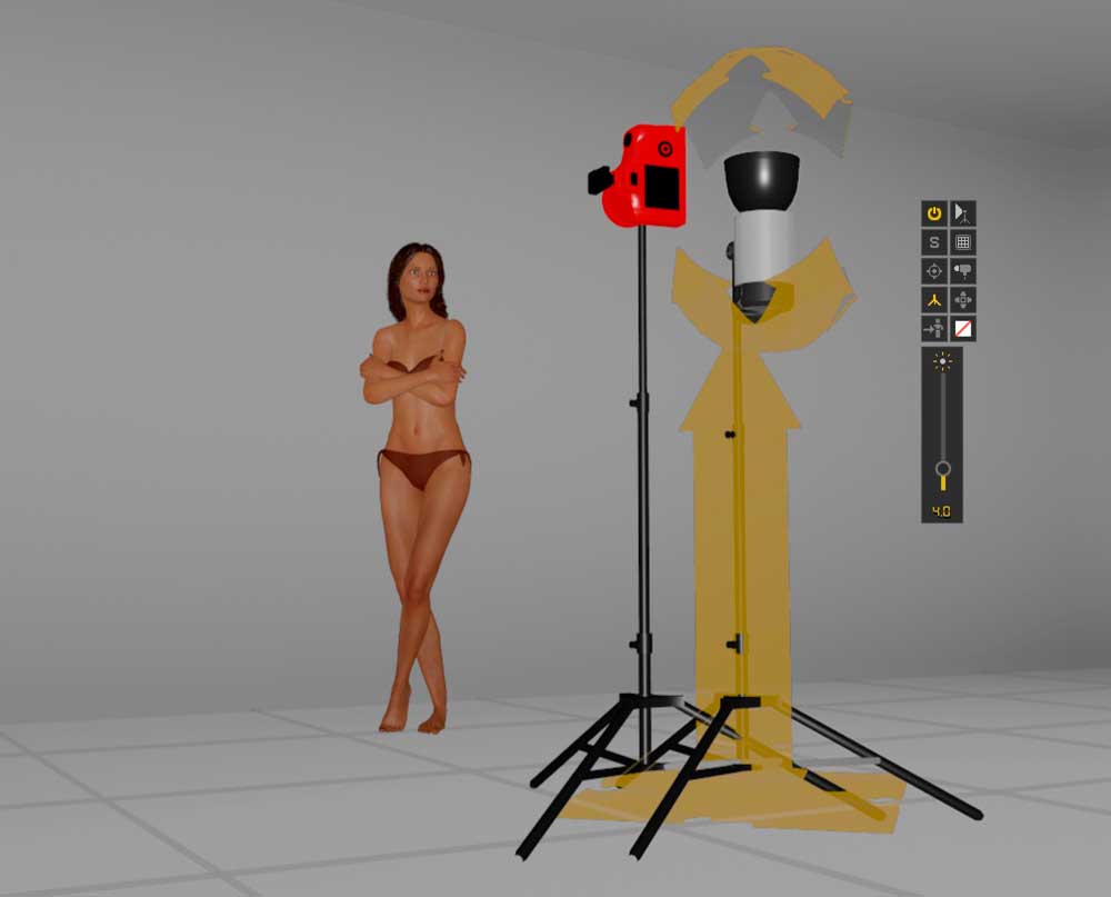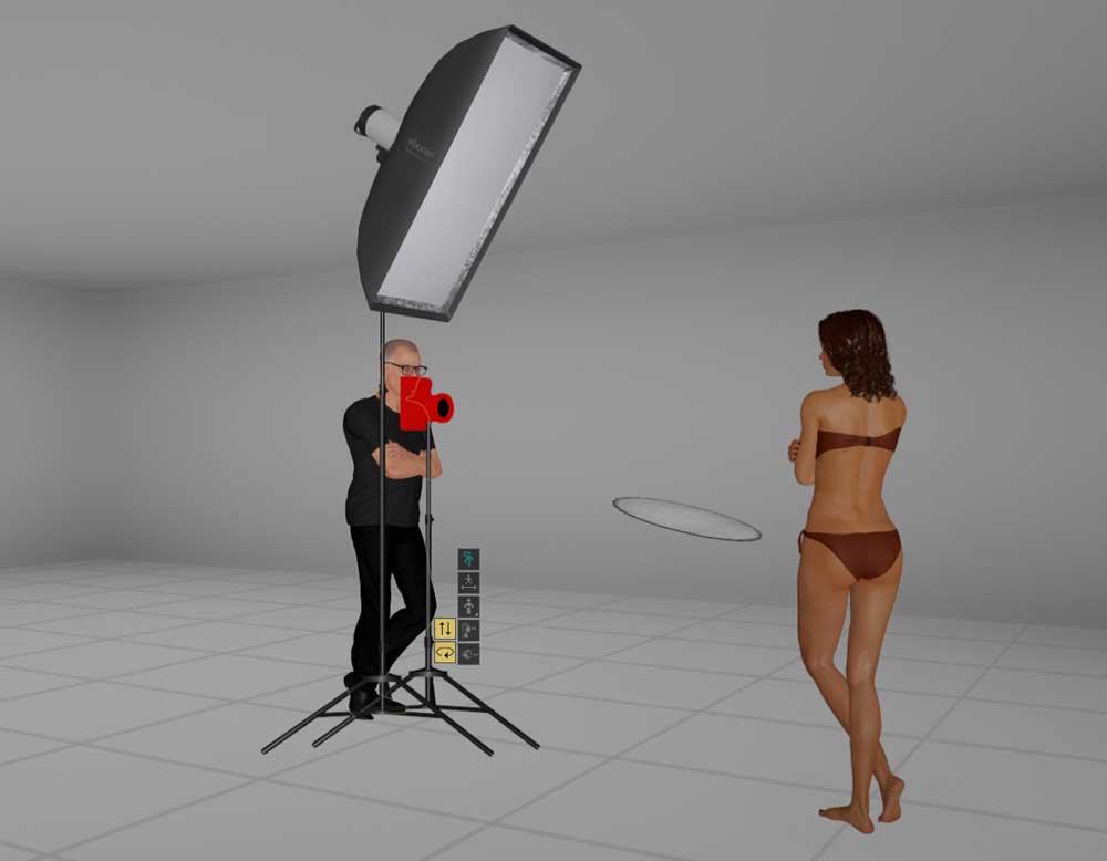 Um mit Licht, das hochfrontal ist, zu üben, begeben wir uns zunächst in eine Art Ausgangsstellung. Wir platzieren unser Modell Victoria im Bikini mit langen braunen Haaren, dezent geschminkt vor einer grauen Wand und lassen sie die erste Standardpose in der »Posen Vorlagen Frauen«-Sektion »Stehend« einnehmen. Beleuchtet wird Victoria mit einem gegen die Decke gerichteten 500 Wattsekunden (W/s) Studioblitz mit Standardreflektor. Der ist auf Stufe 4.0 eingestellt, was einer Lichtleistung von 8 Wattsekunden entspricht. Solche Angaben sind für Sie noch Böhmische Dörfer? Kein Problem. Die Art und die Leistungsfähigkeit des Blitzes sowie seine Einstellung sind im Grunde von untergeordneter Bedeutung. Das ganze funktioniert auch mit einem kleinen Systemblitz oder einem Studioblitz mit anderen Leistungsgrößen. Verändern muss man dann nur die Abstände und/oder die Belichtungswerte der Kamera. Direkt neben den Blitz stellen wir unsere Vollformat-Kamera und wählen ein 85-Millimeter Porträt-Tele, sowie eine 1/125 Sekunde Belichtungszeit, Blende f/2.0 und 100 ISO. Den Weißabgleich der Kamera stellen wir analog zu dem des Studioblitzes auf 5600 Kelvin ein. Jetzt muss nur noch der Bildausschnitt nach Gusto festgelegt werden. Dann ist die Vorbereitung fertig.