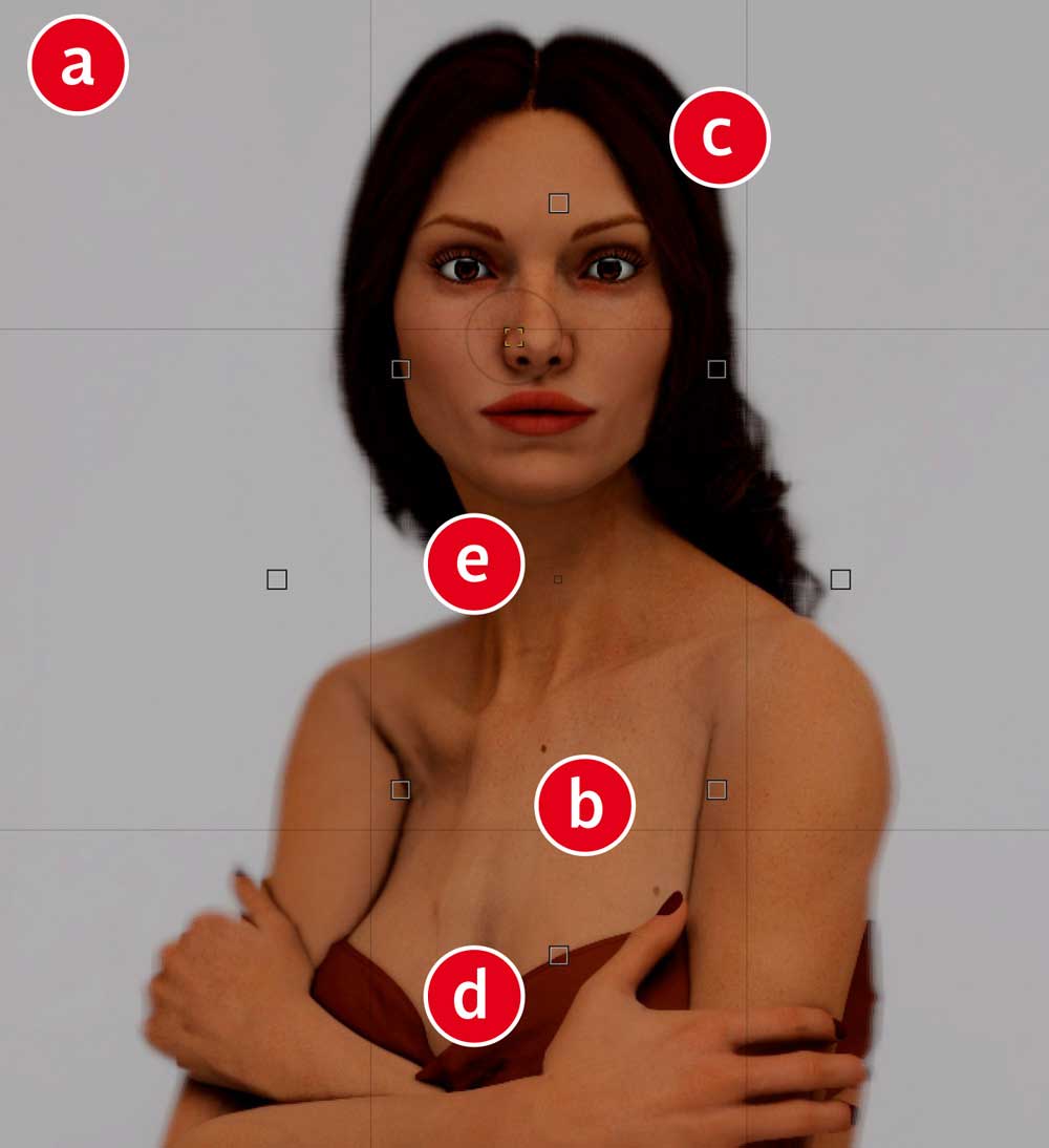 Was sehen wir? Ein diffus ausgeleuchtetes Porträt von Victoria (a). Die weiche Ausleuchtung kommt vom indirekten Licht, weil die Leuchte ja gegen die (hier drei Meter hohe) weiße Decke gerichtet ist. Daher verteilen sich die Lichtstrahlen ungerichtet im Raum und auf unserem Model. Das hat verschiedene Effekte: Im Wesentlichen bleibt alles weich: Die Textur der Haut (b), die der Haare (c) und des Stoffes (d), die Kontraste der Körperstrukturen und vor allem die Schattenverläufe (e). Diese Ausleuchtung erinnert an einen trüben Tag, an dem die Sonne von dichten Wolken verdeckt wird.