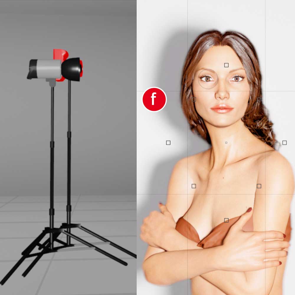 Nun verändern wir den Winkel der Lampe um 90 Grad. Danach leuchtet sie nicht mehr die Decke an, sondern Victoria direkt ins Gesicht. Im Bild ist sie jetzt stark überbelichtet, man erkennt deutlicher die Texturen des Haares und auch die Körperstrukturen treten stärker hervor. Trotz des jetzt erzeugten Schlagschattens, der sich auf der Wand (f) im Hintergrund zeigt, wirkt der Körper aber weiterhin relativ flach und zweidimensional.