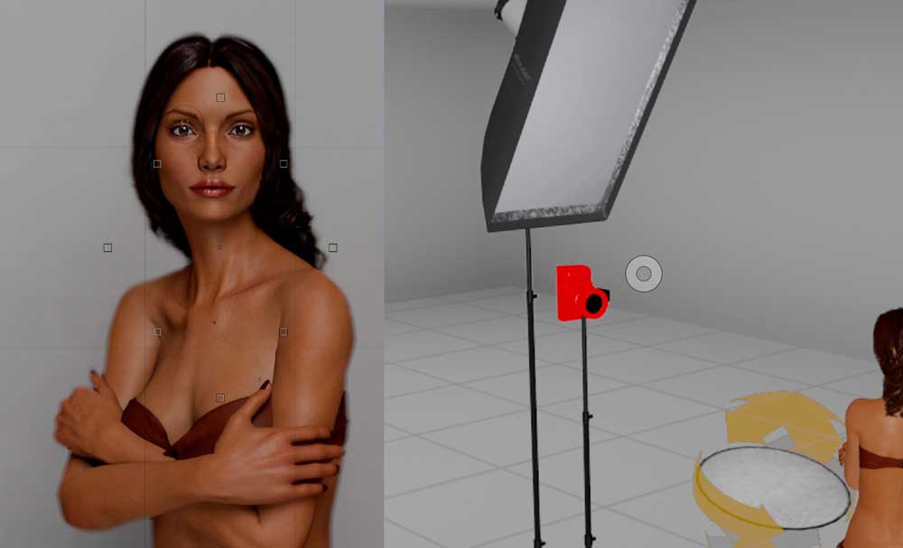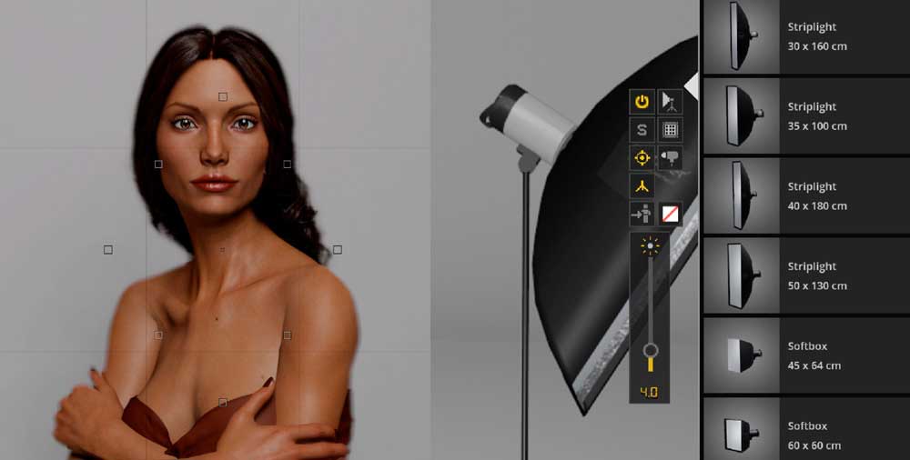 Ein Studiobitz Tutorial sollte mit einfachen Übungen beginnen. Wie fangen hier mal mit dem Hochfrontalen Licht an. Glücklicherweise ist das beim Lichtsetzen etwas einfacher und mit einer Lernumgebung wie Set.a.light 3D gehen die ersten Schritte unendlich viel schneller. Beginnen wir also zunächst mit einem Lichtsetting, das sich schon oft als schmeichelhaftes Porträtlicht bewährt hat. Man nennt das Hochfrontale Licht auch Marlene-Dietrich-Licht. Angeblich, weil die Filmdiva der 30er und 40er Jahre aus purer Eitelkeit darauf bestand, nur auf diese Weise – hochfrontal – ausgeleuchtet zu werden. Warum? Das werden wir später sehen.