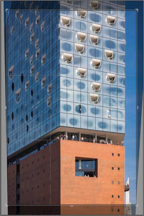 Im folgenden Beispiel habe ich die stürzenden Linien »Mit Hilfslinien« in die Senkrechte gebracht. Lightroom würde das entzerrte Bild dann automatisch so beschneiden: