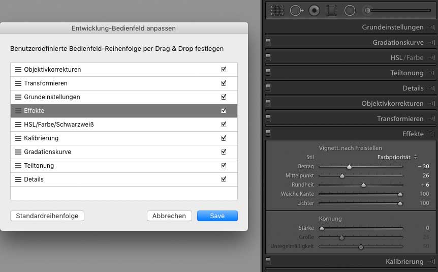 Lightroom 8.1: Eigene Bedienfeldsortierung
