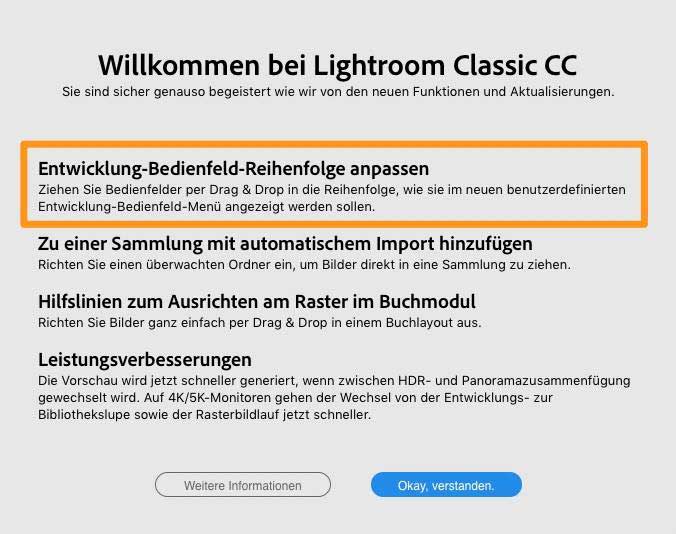 Im vor kurzem erschienenen Update auf Version 8.1 von Lightroom Classic CC (nicht zu verwechseln mit Lightroom CC) gibt es – neben anderem (siehe Screenshot) – eine kleine Neuerung, die ich beinahe übersehen hätte, obwohl sie an erster Stelle im Hinweis aufgeführt wurde: Man kann nun im »Entwickeln«-Modul die Reihenfolge der Bedienfelder nach dem eigenen Geschmack sortieren.