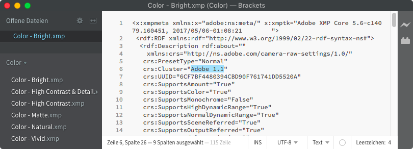 Für die Modifikation der Dateien brauchen Sie einen Texteditor. Hierfür wäre beispielsweise das kostenlose Brackets geeignet, das es in Versionen für Windows und macOS gibt. Öffnen Sie damit alle Vorgabendateien und suchen Sie darin eine Zeile, in der ein Feld „Cluster“ definiert ist. Die »Cluster« bieten eine weitere Möglichkeit, Vorgaben zu sortieren, auf die Sie abber innerhalb von Lightroom oder Camera Raw keinen Einfluss haben. Vorgaben werden zunächst nach Clustern sortiert, innerhalb eines Clusters nach dem Gruppennamen, und darin nach den Namen der Vorgaben selbst. Bei Ihren eigenen Vorgaben oder denen von Drittanbietern ist der Name des Clusters die leere Zeichenkette („“), bei Adobes Vorgaben aber beispielsweise „Adobe 1.0“ oder „Adobe 1.1“. Sie brauchen nun lediglich den Namen zwischen den Anführungszeichen in dieser Zeile zu löschen, um Adobes Vorgaben zur Beachtung der Sortierreihenfolge anzuhalten – alle Vorgaben, egal von welchem Anbieter, befinden sich dann im selben Cluster. Wenn Sie Ihren eigenen Vorgabengruppen Namen geben, die beispielsweise mit einem Leerzeichen oder einer Ziffer beginnen, stehen diese ganz vorne – Adobes Vorgaben müssen sich hinten anstellen.