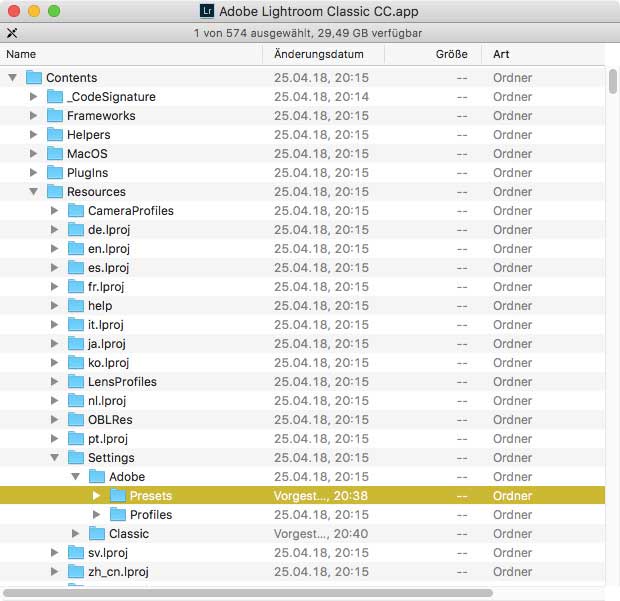 Es gibt nun zwei Möglichkeiten: Falls Sie auf Adobes Vorgaben verzichten wollen, können Sie sie löschen. Oder Sie sorgen, weniger rabiat, nur dafür, dass sich alle Vorgabengruppen an die alphabetische Sortierung halten. In beiden Fällen ist es entscheidend, alle Vorkommen der Vorgabendateien zu erwischen. Unter dem von mir bevorzugten macOS finden sich diese Dateien einmal im Ordner „/Library/Application Support/Adobe/CameraRaw/Settings/Adobe/Presets“, und um sie entweder zu löschen oder mit einem Texteditor zu modifizieren, müssen Sie sich mit dem Administrator-Passwort legitimieren. Das reicht jedoch noch nicht, denn es gibt zusätzlich eine Kopie innerhalb der Anwendung selbst. Unter macOS klicken Sie „Adobe Lightroom Classic CC.app“ an und wählen im Kontextmenü »Paketinhalt einblenden«. Die Vorgaben finden Sie dann in „Contents/Resources/Settings/Adobe/Presets“. Falls Sie die Vorgaben editieren wollen, können Sie sich auf die Dateien in „/Library/Application Support/Adobe/CameraRaw/Settings/Adobe/Presets“ beschränken und die Kopien in der Anwendung löschen – sonst müssen Sie diese ebenfalls editieren.