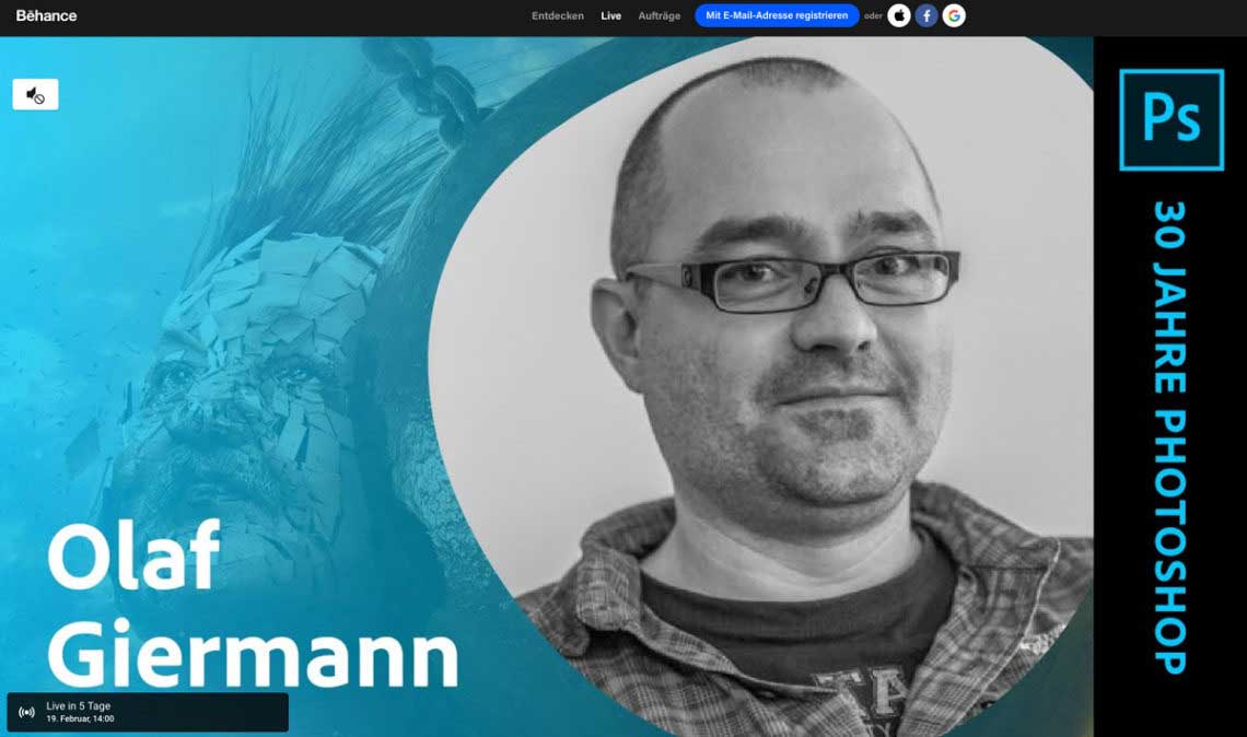 Anlässlich des 30. Geburtstags von Photoshop veranstaltet Adobe Live nächste Woche an drei Tagen eine kleine Online-Streaming-Geburtstagsfeier, bei denen verschiedenen Fotografen, Illustratoren und Künstler live ihre Denk- und Vorgehensweisen zeigen und auf Fragen im Chat eingehen. Hier geht es zu dem deutschen Kanal von Adobe Live. Ich freue mich sehr, auch dabei sein zu dürfen. Falls Ihr Zeit und Lust habt, schaut mal rein, am Mittwoch, den 19. Februar von 14 bis 16 Uhr. Hier schon mal der Direkt-Link.