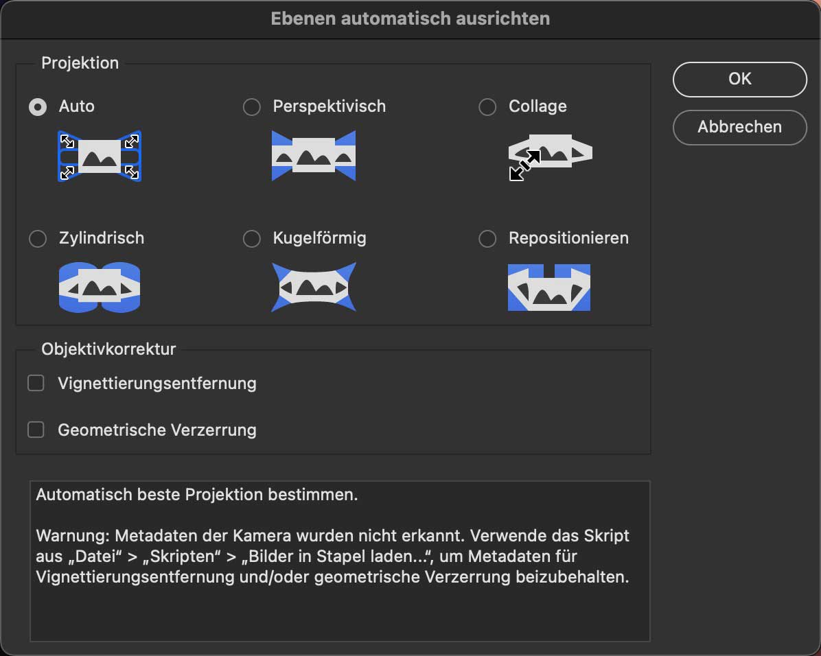 Am einfachsten bringen Sie zwei ähnliche Bilder in Photoshop mit dem Befehl »Bearbeiten > Ebenen automatisch ausrichten« zur Deckung. Dafür markieren Sie beide Ebenen mit gehaltener Strg/Cmd-Taste und bestätigen dann anschließend den folgenden Dialog mit »OK«. Dafür müssen Sie den Ebenenmodus auch nicht vorher wieder auf »Normal« zurückstellen.