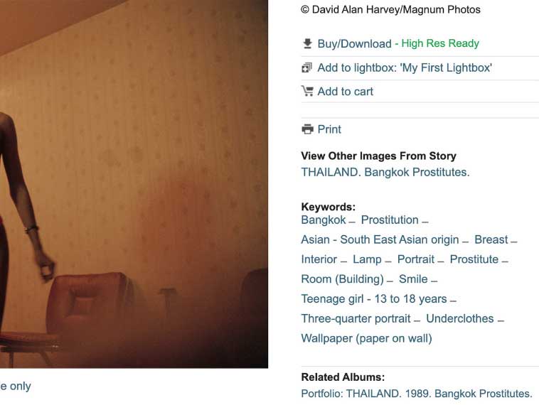 Vor knapp zwei Wochen kritisierte ein Artikel der Website Fstoppers, dass Magnum Fotos verkaufen würde, die sexuellen Missbrauch von Kindern zeigen. Einige davon stammen aus einem Projekt des Magnum-Mitglieds David Alan Harvey aus dem Jahre 1989: „THAILAND. Bangkok. 1989. Thai prostitutes.“ Beispielsweise ist in einem der Bilder ein halbnacktes minderjähriges Mädchen zu sehen, das sich lächelnd dem Fotografen nähert, der anscheinend auf einem Bett sitzt – der Fotograf hatte die Perspektive eines Freiers gewählt. Zu den Schlagwörtern, unter denen man dieses Bild seit vielen Jahren finden konnte, gehören „Prostitute“, „Breast“ und „Teenage girl – 13 to 18 years“.