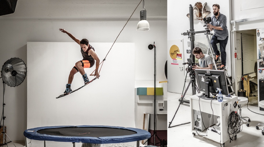 Mit an Bord als Motivmittelpunkt: der zweifache Weltmeister im Wakeboarding, der auf einem Trampolin in Paul Ripkes Studio eindrucksvolle Sprünge mit seinem Wakeboard vollführt. Ausgeleuchtet wird er dabei von vier Lampen, die im Rechteck um diese „Bühne“ angeordnet sind. Damit für eine hohe Auflösung des zentralen Motivs gesorgt ist, fotografiert Ripke den Wakeboarder mit einer PhaseOne-Mittelformatkamera, an die ein 80-Megapixel-Rückteil montiert ist.