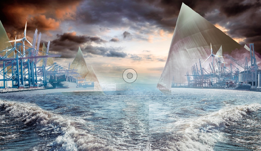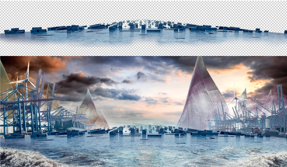 Schon die grob zusammengesetzte Vor-Montage zeigt deutlich, dass es Nik Ainley nicht um ein perspektivisch glaubhaftes Arrangement der Einzelteile geht. Im Gegenteil, im Vordergrund steht der surreale Effekt, das Übertriebene, das Dramatische: Ein dunkler Himmel, schräg von den Seiten ins Bild ragende Hafenanlagen und zusätzliche, segelartige Gebäude, die eher architektonisch interessant als funktional wirken, sollen das Auge des Betrachters durch die Geschehnisse im Bild lenken.
