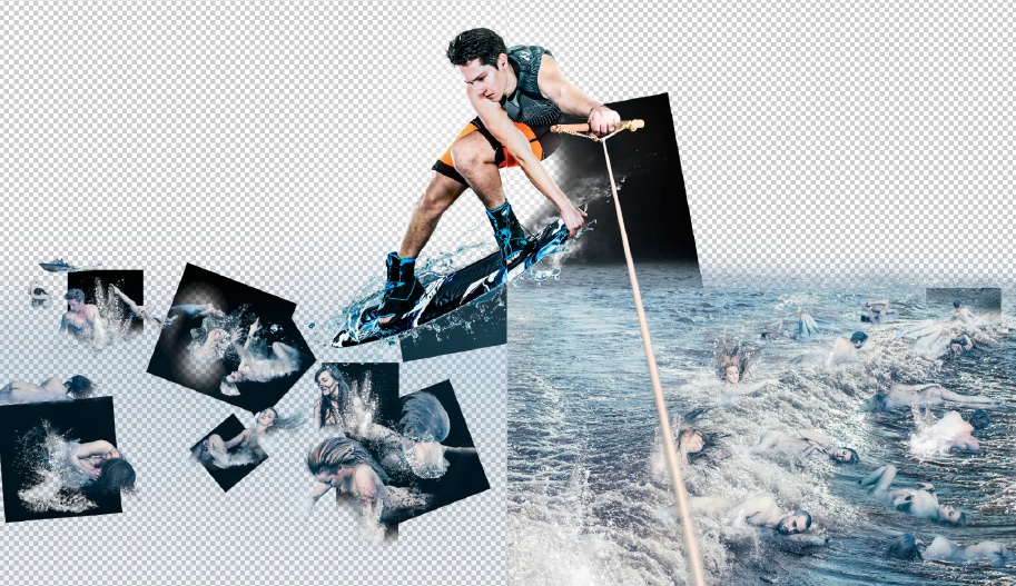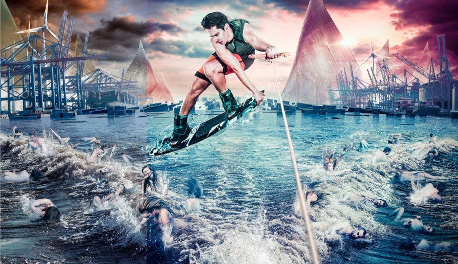 Rund zwei Dutzend Menschen tummeln sich in den Heck-Wellen des für den Betrachter unsichtbaren Zugbootes, das dem wakeboardenden Protagonisten die nötige Energie für seine Sprünge gibt. Sie sind farblich so weit an die Wellen angeglichen, dass man sie vielleicht erst auf den zweiten Blick bemerkt. Ganz im Gegenteil zum Wakeboarder selbst, der hier jedoch noch farblich und durch ausgeprägte Kontraste, wie sie für Blitzlampen typisch sind, aus dem Rest des Bildes heraussticht.