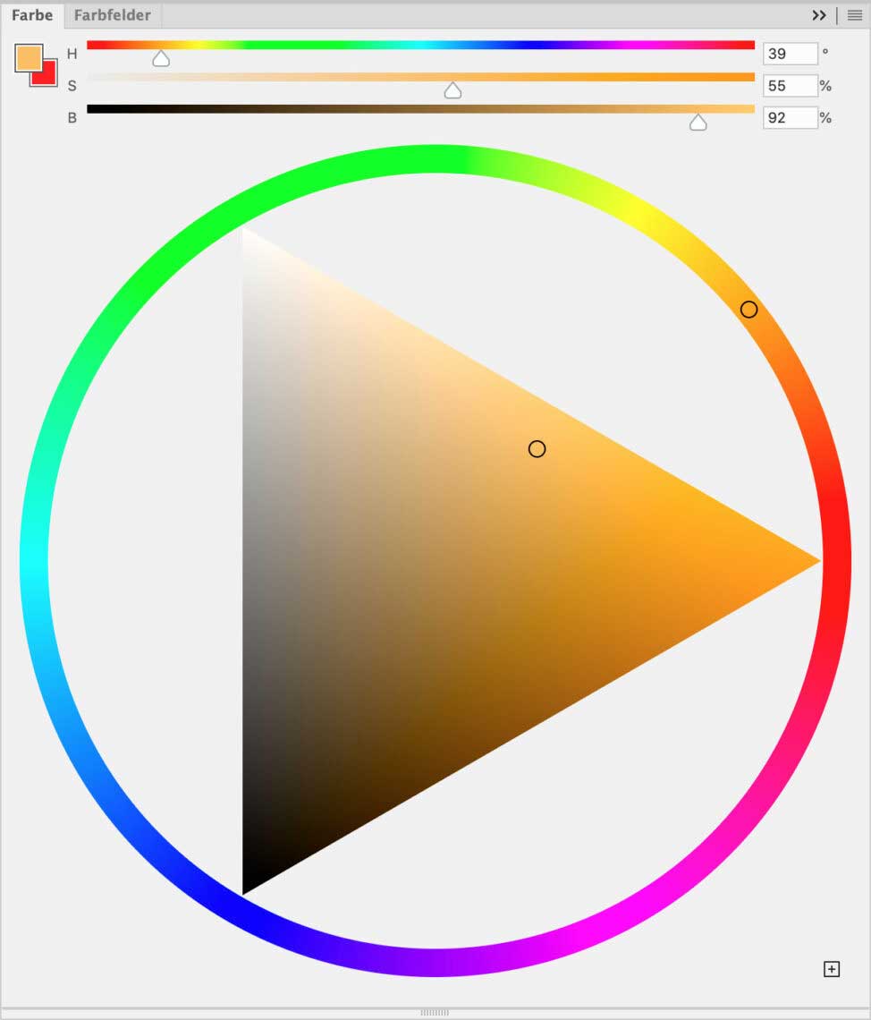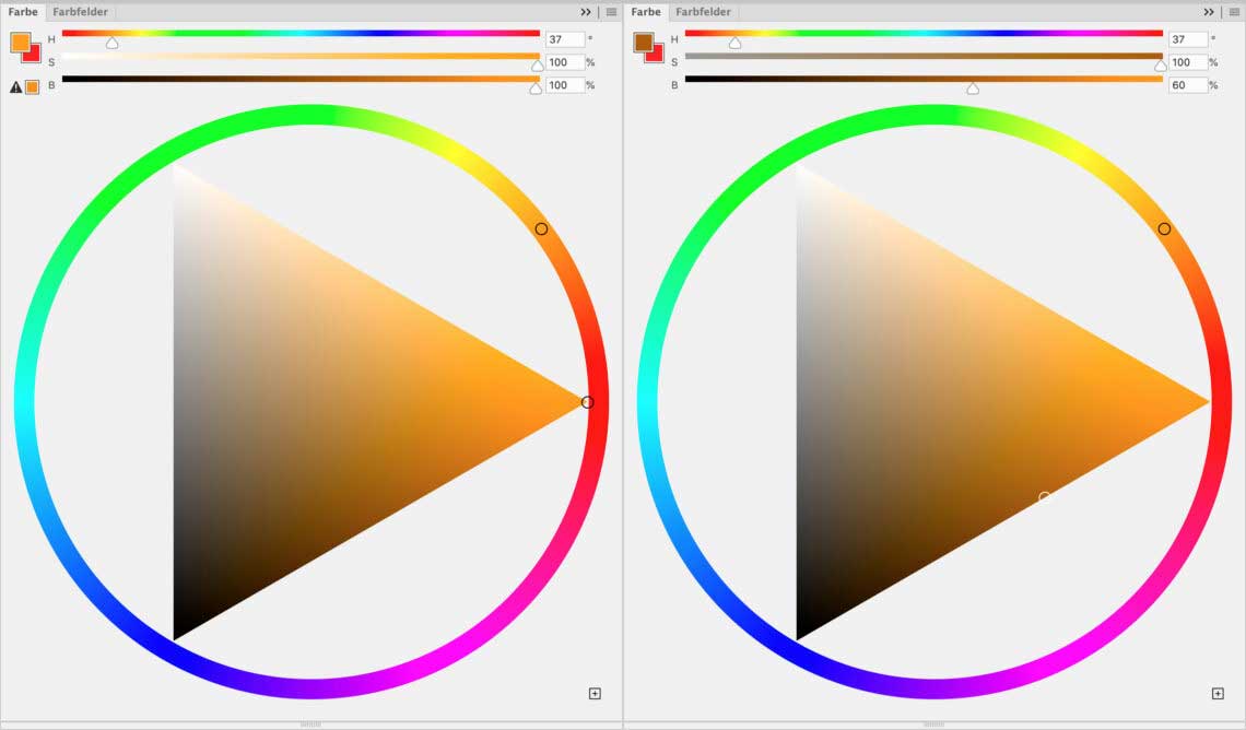 Aus dieser Besonderheit von Orange wird nun klar, weshalb es kein dunkles Orange geben kann, denn ein dunkles Orange wäre Braun. Umgekehrt gibt es aber auch kein helles, gesättigtes Braun, denn wenn wir die Helligkeit vergrößern, wechselt die Farbe wieder zurück zu Orange. Wenn wir Milch in unseren Kaffee tun, wird aus dem dunklen zwar ein helles Braun, aber durch die Zugabe von Weiß ist es vor allem weniger gesättigt. Auf demselben Weg können wir in Photoshop ein helles Milchkaffeebraun mischen, indem wir die Sättigung reduzieren und die Helligkeit heraufsetzen. Im Extremfall wandelt sich die Farbe dann zu Beige, dem hellsten Braun.