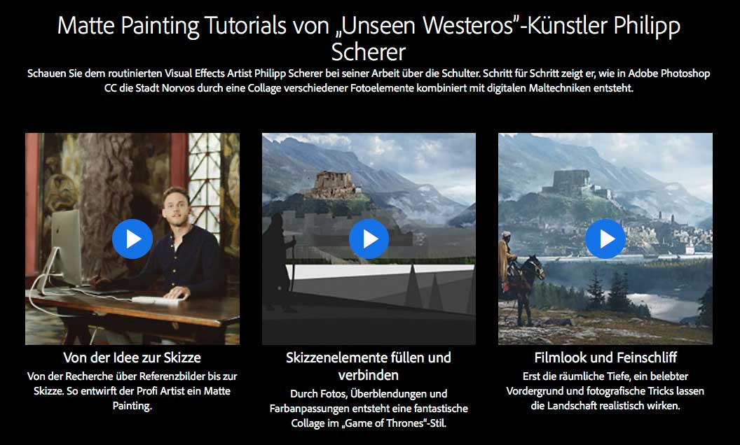 Wenn Sie jedoch ganz nach unten scrollen, finden Sie drei Matte Painting-Tutorials von „Unseen Westeros”-Künstler Philipp Scherer, die die Vorgehensweise im Detail erklären.