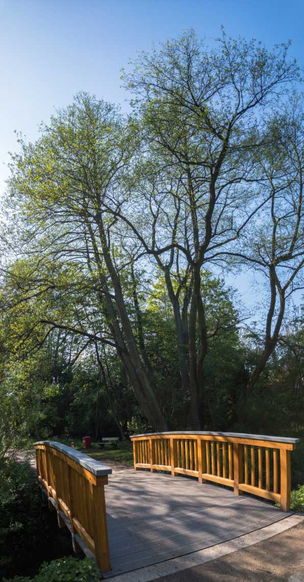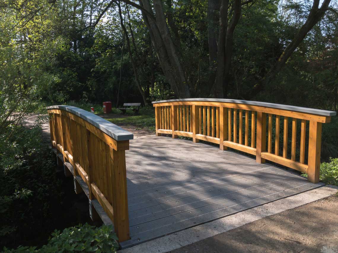 Vor ein paar Tagen ging ich an der Alster entlang und stieß auf diese neue Brücke, die ich aus rein dokumentarischen Gründen mit dem iPhone X fotografierte – jahrelang hatte hier das Vorgängerbauwerk vor sich hin gemodert, und ich war überrascht, dass nun doch endlich eine neue Brücke gebaut worden war, bevor die alte unter ihrem eigenen Gewicht zusammenbricht. Aber dann kam mir die Idee, noch etwas von der Umgebung einzufangen, und ich machte vier weitere Aufnahmen, für die ich das Smartphone schrittweise nach oben kippte, so dass sich die einzelnen Bilder überlappten.