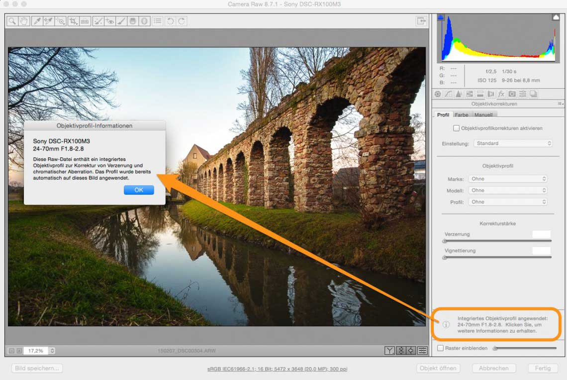 Bei der Verwendung von Camera Raw zum Entwickeln der Fotos sah ich aber zum ersten Mal (wahrscheinlich, weil ich sonst nur mit Raws aus DSLRs und Mittelformatkameras zu tun habe) den folgenden Hinweis: „Diese Raw-Datei enthält ein integriertes Objektivprofil zur Korrektur von Verzerrung und chromatischer Aberration. Das Profil wurde bereits automatisch auf dieses Bild angewendet.“