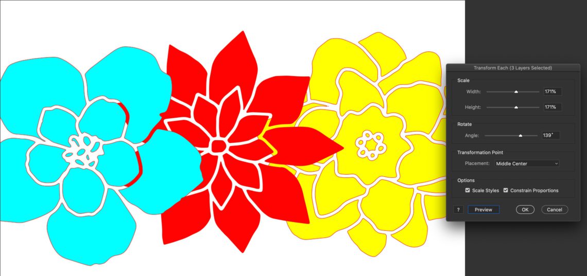 In Photoshop geht das nicht mit Bordmitteln. Wenn Ihr nach der Ebenenauswahl »Frei transformieren« aufruft, könnt Ihr damit nur alle Ebenen wie eine feste Einheit skalieren oder drehen. Abhilfe schafft hier ein kostenloses Script, das Ihr hier herunterladen könnt: Transform Each 2.1 Update. Über »Datei > Skripten > Durchsuchen« ruft Ihr dann nach der Ebenenauswahl das Skript auf. Im Dialog könnt Ihr die Skalierung und den Drehwinkel bestimmen. Um den Effekt zu sehen, müsst Ihr leider nach jeder Änderung auf »Preview« klicken. Das Skript ist schon etwas älter, funktioniert aber auch in Photoshop 2020. Photoshop CS5 und Photoshop CS6 werden ebenfalls unterstützt.