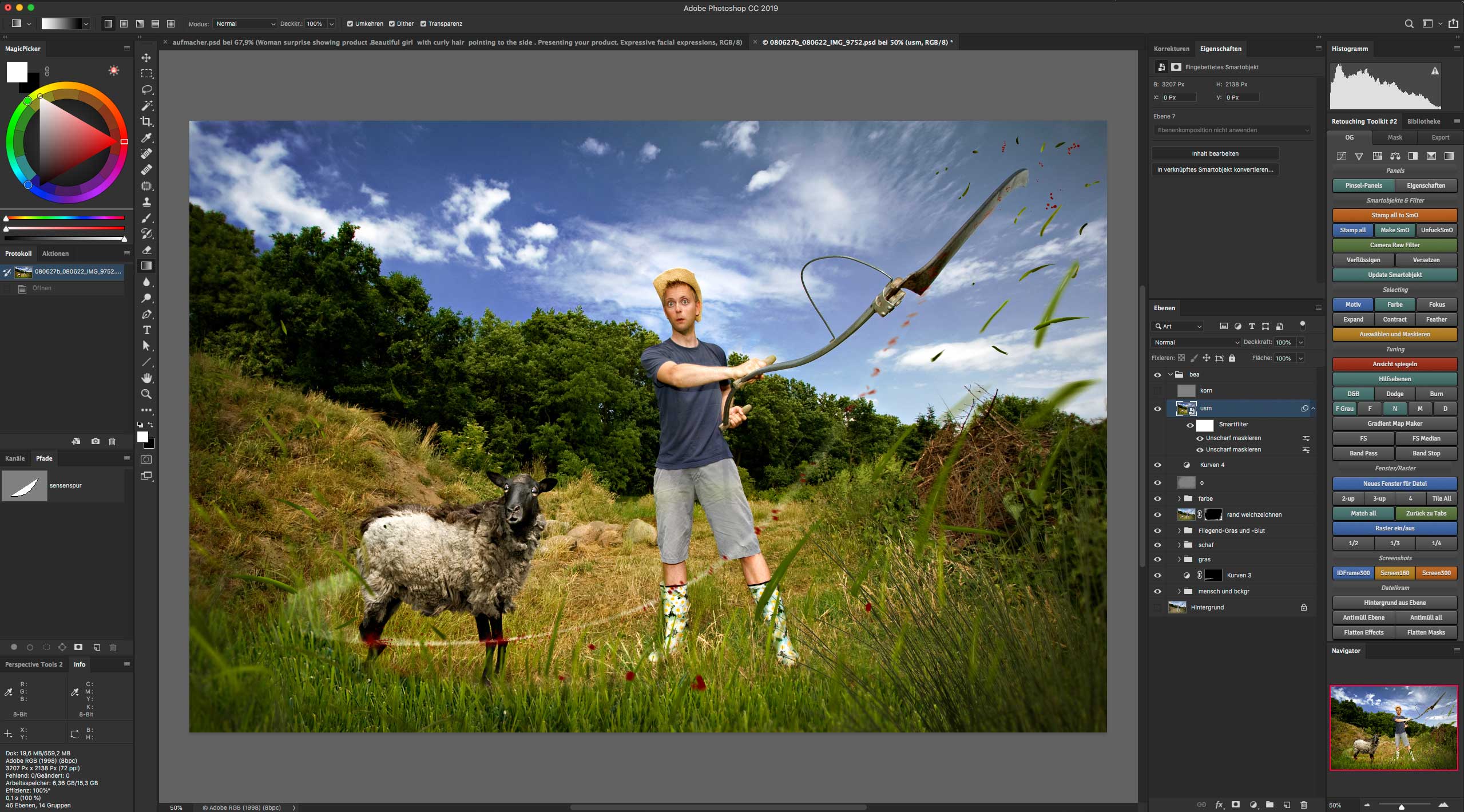 Ich versuche immer, so effizient wie möglich zu arbeiten. Deshalb nutze ich Tastaturkürzel und Photoshop-Erweiterungen. Der MagicPicker von Anastasiy, dessen Panel Sie oben links im Screenshot sehen, ist auch in Photoshop CC 2019 den noch beschränkten Möglichkeiten des verbesserten »Farbe«-Fensters deutlich überlegen.
