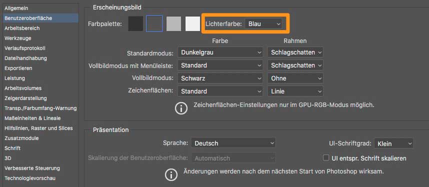Die Helligkeit der Benutzeroberfläche und die Helligkeit des Arbeitsflächenhintergrundes passe ich meist „on-the-fly“ je nach Bedarf (mehr Info) an. Unter »Benutzeroberfläche« setze ich aber die »Lichterfarbe« von Grau auf Blau. So sieht man deutlicher, welche Ebene, welcher Kanal, welcher Pfad … gerade aktiv ist.