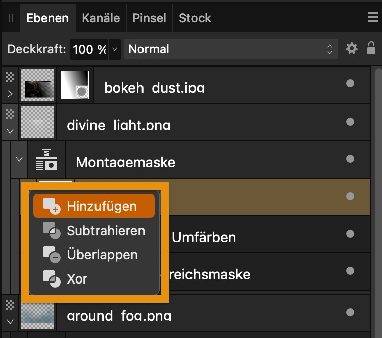 Die ebenfalls neue Montage-Maske ist ein Container, innerhalb dessen man Masken mit logischen Operationen kombinieren kann (Hinzufügen, Subtrahieren, Überlappen und Xor).