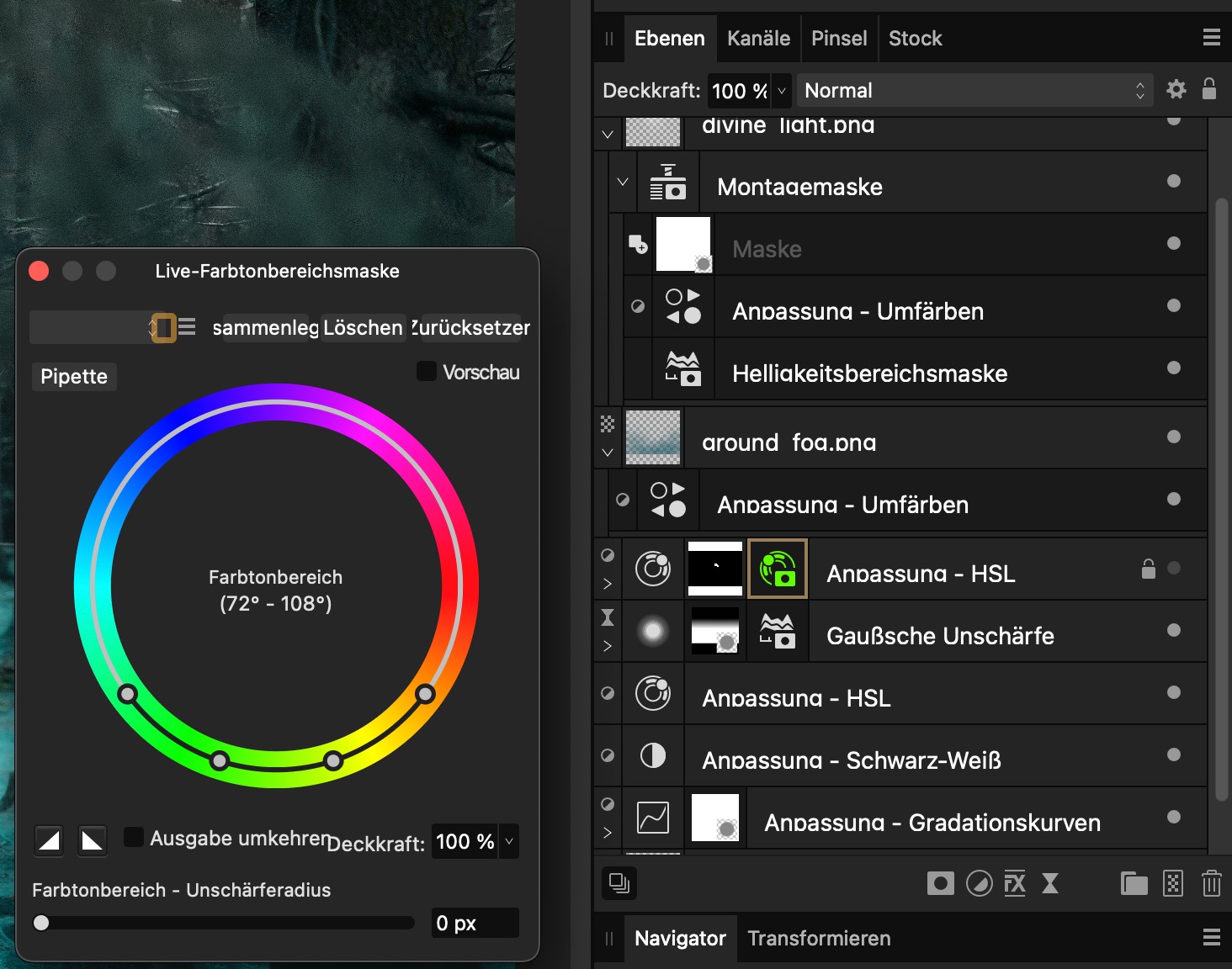 Noch eine solche Funktion, die ich gern in Photoshop sehen würde. Denn in Camera Raw und Lightroom Classic gibt es diese Live-Masken bereits: basierend auf Luminanz und Farbe. In Affinity Photo steht beides nun in der »Ebenen«-Palette zur Verfügung. Zusätzlich gibt es eine Bandpass-Option, mit der man im Prinzip Kanten-/Flächenmasken erzeugen kann. Und alles ist live – passt sich also dem Bild darunter an und kann jederzeit verändert werden.