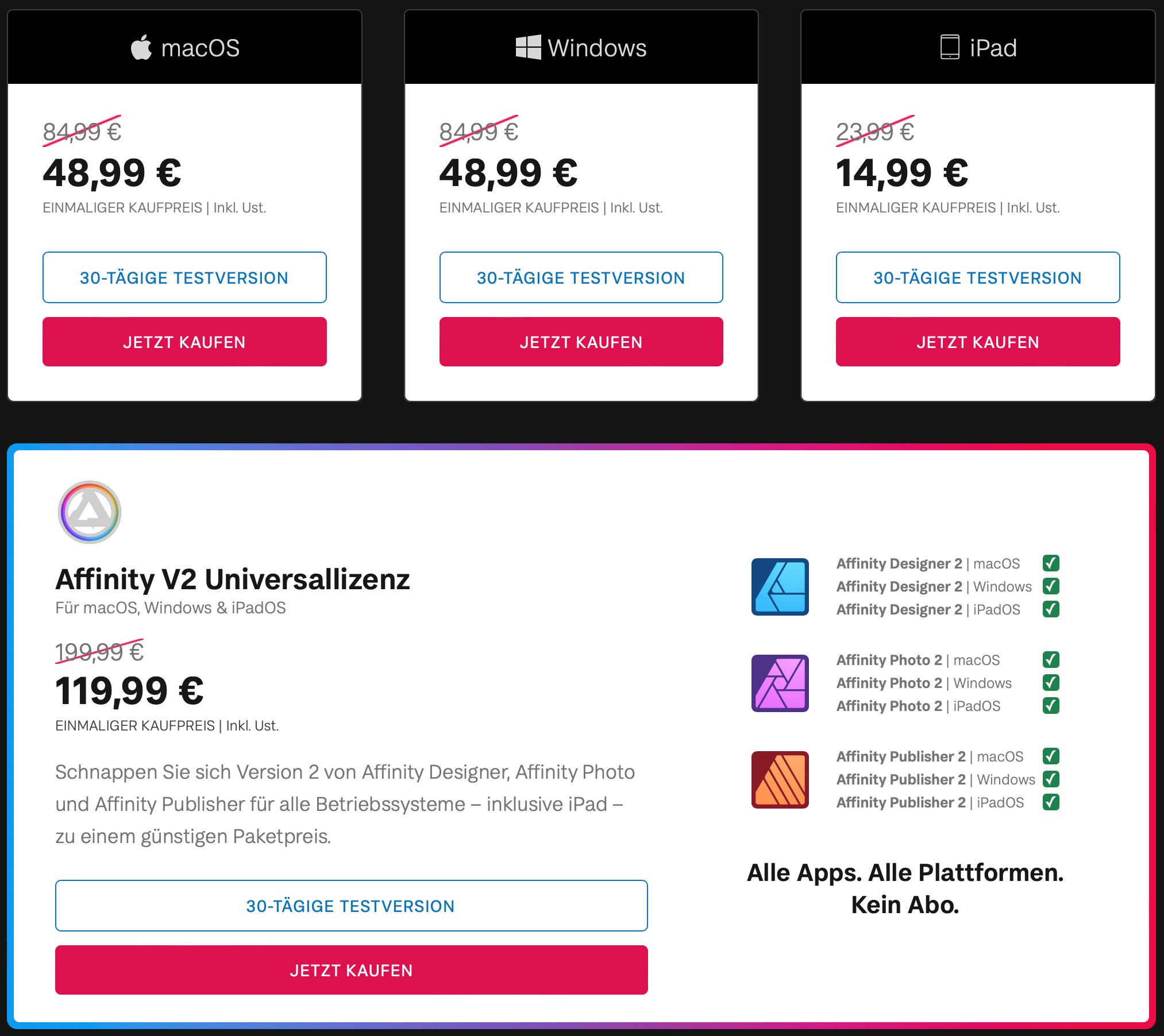 Wow! 120 Euro für eine Universallizenz ist ein absoluter Kampfpreis (nach Ablauf der Einführungsfrist 200 Euro). So viel kostet das reguläre Foto-Abo von Adobe für ein Jahr. Und Serif bietet dabei aber ganze sechs Programme als Dauerlizenz an: die Bildbearbeitung Affinity Photo 2, das Vektorprogramm Designer 2 und die Layoutsoftware Publisher 2 – inklusive Windows- und Mac-Version. Und alle drei Programme noch einmal in der iPad-Version mit beinahe vollständig gleichem Funktionsumfang wie bei den Desktop-Versionen. Dank der iPad-Version von Publisher und den anderen beiden nahtlos integrierten Apps könnte man nun erstmalig einen ganzen Publishing-Workflow allein auf dem iPad abbilden.