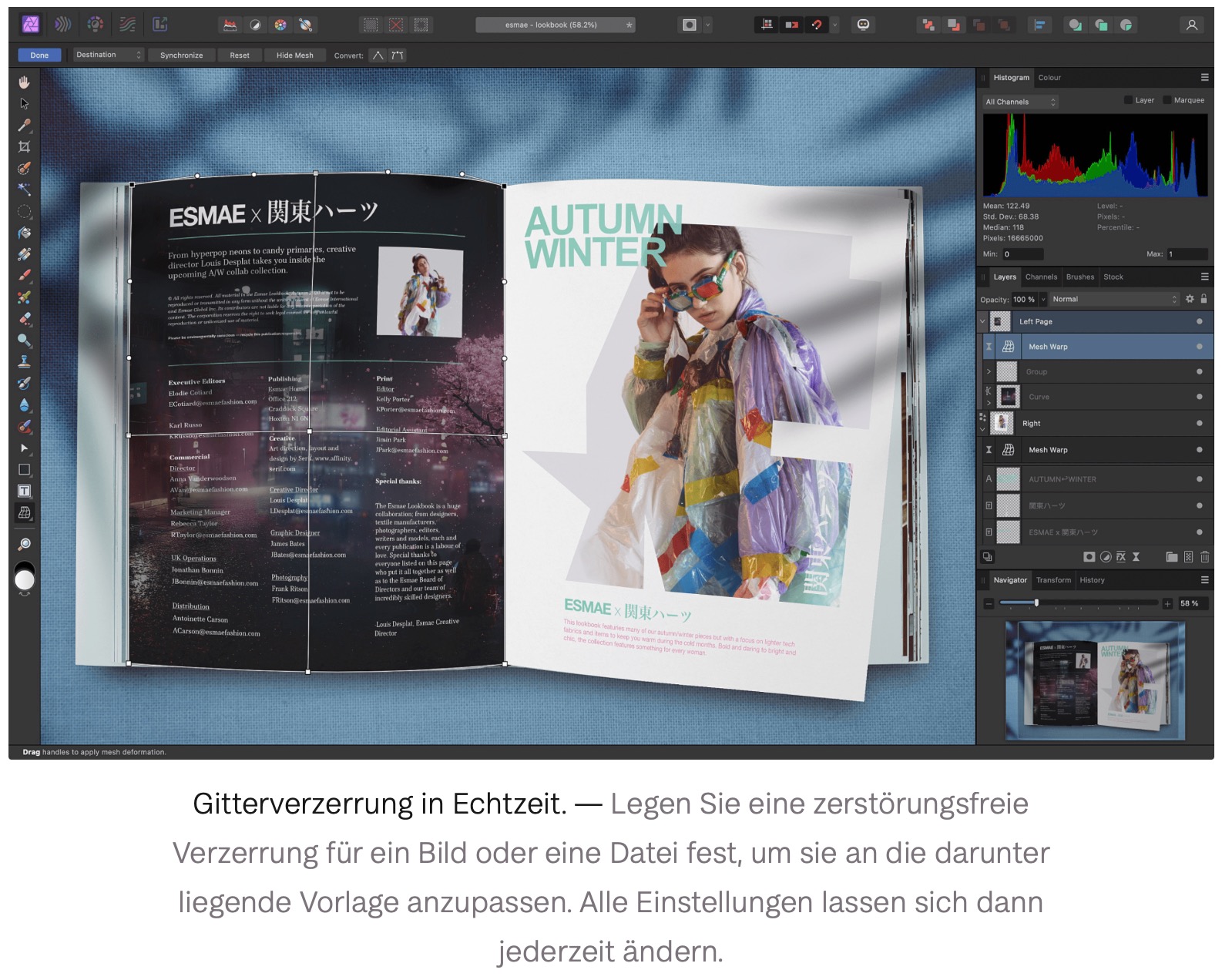 In Version 1 gab es die Gitterverzerrung nur als destruktiv anzuwendendes Werkzeug. Jetzt steht sie auch als Live-Filter-Ebene zur Verfügung. Das ermöglicht Mock-ups, wie sie zuvor nur in Photoshop (über Smartobjekte) möglich waren. Beispielsweise lässt sich damit eine Ebene an eine gewellte Oberfläche anpassen. Tauscht man die Ebene gegen ein anderes Foto aus, passt die Gitterverzerrung dieses automatisch an.
