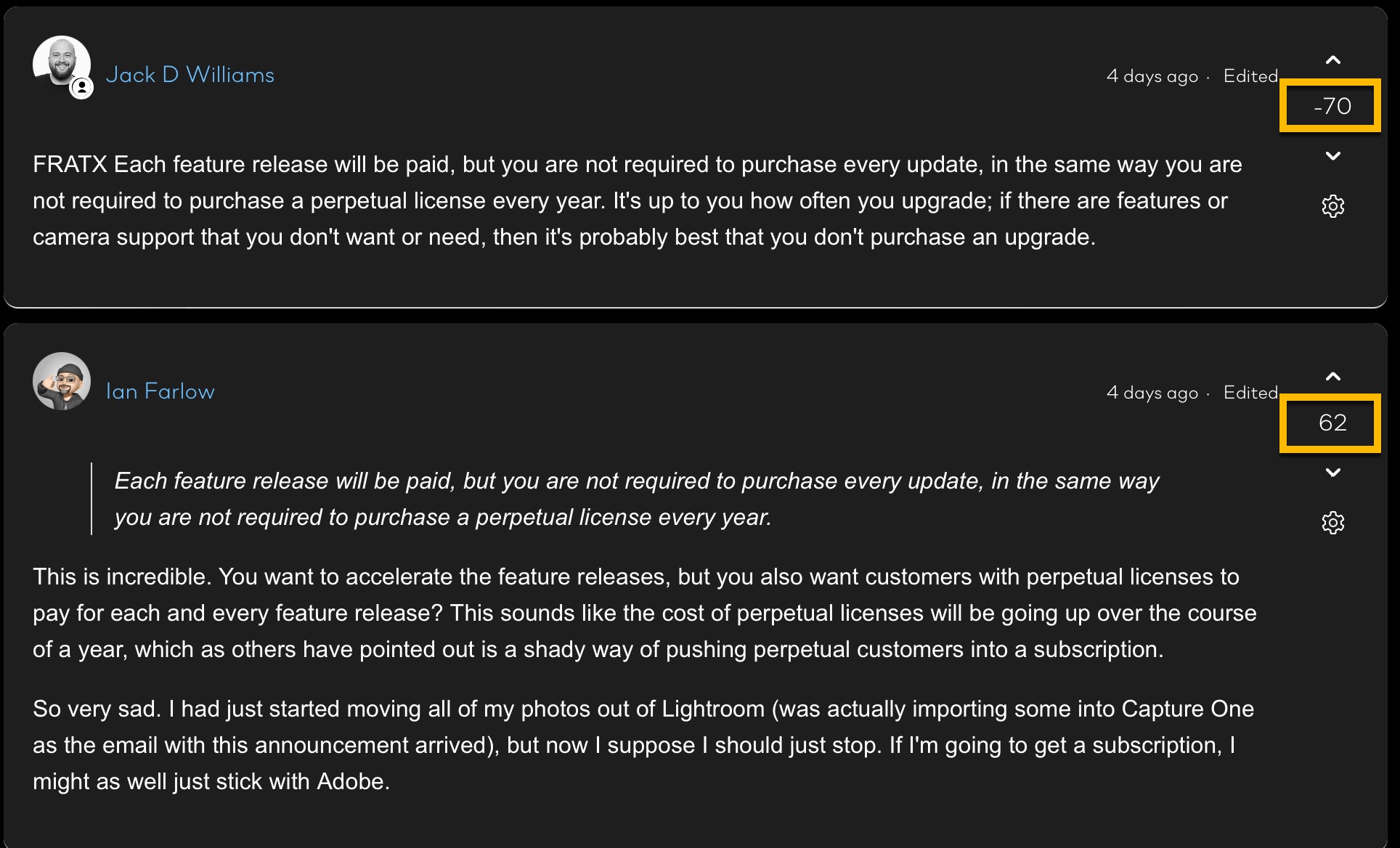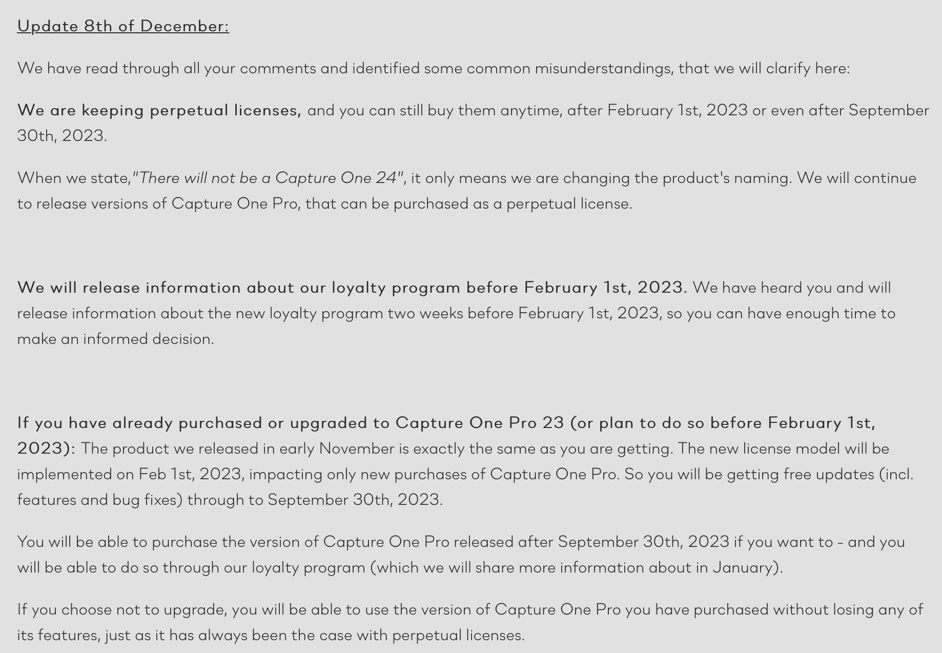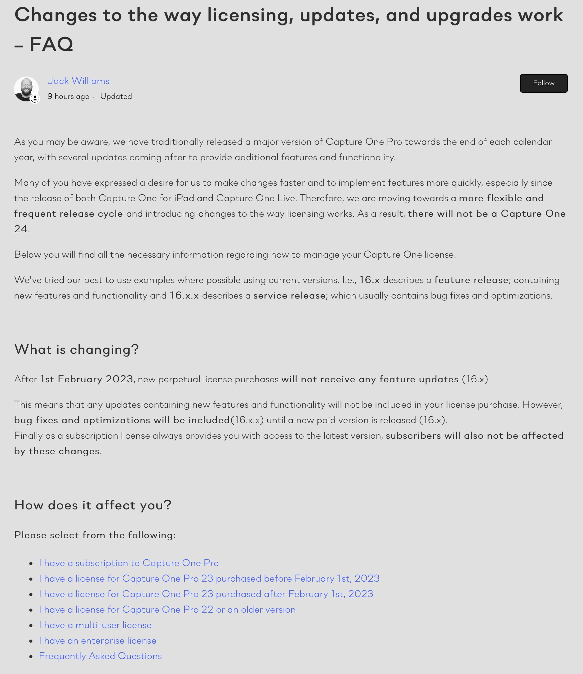 Natürlich präsentierte Capture One die Änderung des Lizenzsystems im Blogbeitrag als Verbesserung: Viele Anwender würden sich schnellere Änderungen und häufigere Funktions-Updates wünschen. Dies würde durch das neue Lizenzierungssystem ermöglicht. Wie das genau aussehen sollte, blieb zunächst unklar. Vor allem deshalb, weil auch erwähnt wurde, dass es keine neue Capture One Version 24 geben und Dauerlizenzen nach dem 1. Februar 2023 keine Updates mehr erhalten würden. Entsprechend groß war der Aufruhr unter dem verlinkten Blogbeitrag. Capture One hat inzwischen den Blogbeitrag ergänzt, um die Wogen zu glätten.