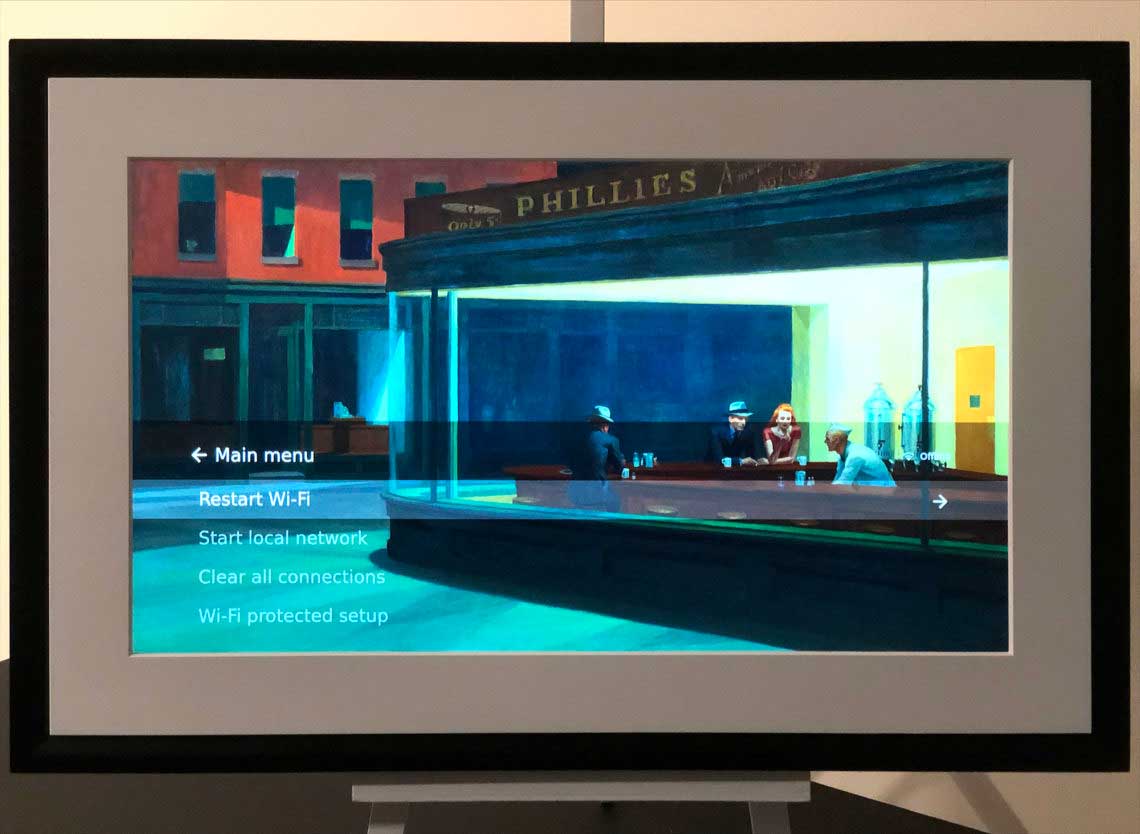 Und wie sieht so ein digitaler Bilderrahmen nun aus? Auf dem matten Display zeigen Bilder zwar nicht dieselbe Brillanz wie auf einem Hochglanzdisplay, aber neben echten Gemälden an die Wand gehängt fügen sich die digitalen Bilder gut ein. Die Kosten eines Meural Canvas II sind zwar hoch – ich würde zur größeren 27-Zoll-Variante greifen – aber wenn Sie Ihre eigenen Bilder an die Wand hängen wollen und eine größere Auswahl in hoher Qualität printen lassen, wird das auch nicht ganz billig. Die Beschränkung auf eine Full-HD-Auflösung ist unproblematisch; dagegen stört das Seitenverhältnis von 16:9, das sich bei bildenden Künstlern keiner großen Beliebtheit erfreut und oft dazu zwingt, die Bilder zu beschneiden. 3:2 oder gar 4:3 wären universeller nutzbar.