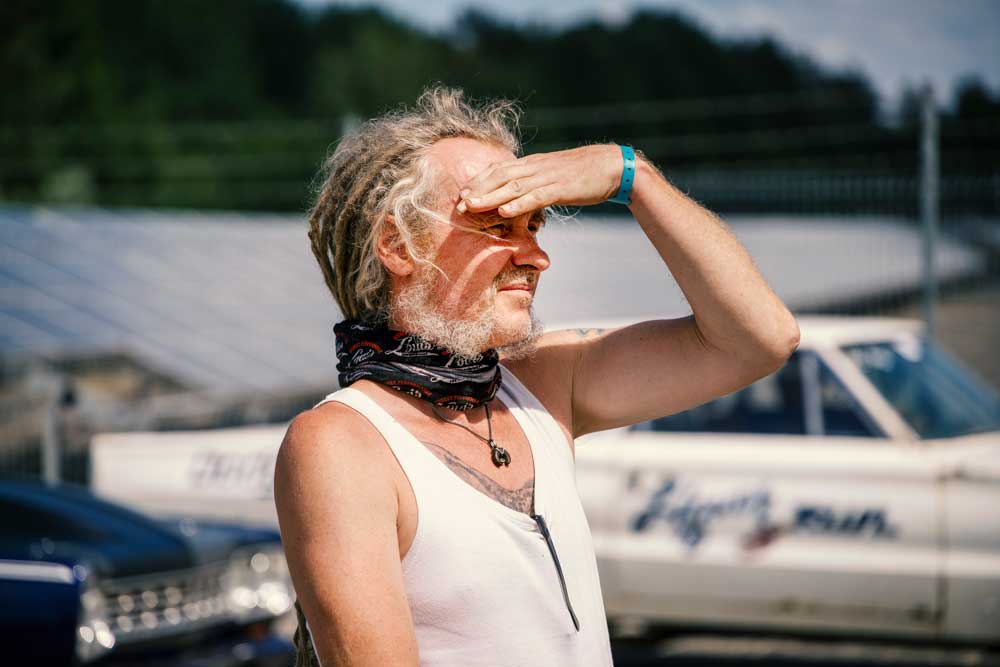 Gegen Mittag ist es voller geworden und es kommen alle Nase lang neue Fahrzeuge auf den Platz, die sich bei der Rennanmeldung registrieren und ihr Fahrzeug vorführen. Danach geht es auf die Strecke. Jetzt greift mein Privileg als Pressevertreter. Während die „normalen“ Besucher das Spektakel nur hinter einem Schutzzaun betrachten dürfen, sind die Pressevertreter ganz nah dran und können sich „auf eigene Gefahr“ in die Nähe der Fahrzeuge begeben. Doch vorher gibt es eine Einweisung für die Verhaltensregeln. Alles sehr professionell. Leider ist diese „Poleposition“ fotografisch relativ unergiebig. Zumindest mit meiner Objektiv-Kamera-Kombination. Für dramatische Nahaufnahmen von durchdrehenden Reifen könnte das Weitwinkel ein wenig weitwinkliger und offenblendiger sein. Das Startergirl steht für die längste Brennweite zu weit weg, wenn ich aus der Perspektive der startenden Autos fotografiere. Versuche ich die Perspektive von der Seite, tritt das Problem der Freistellung vom Hintergrund bei Blende f/4 auf: Die Werbebanner an der Bande lenken vom Hauptmotiv zu sehr ab. Eine Fokussierung ist so nicht möglich. Bei dynamischen Motiven kommt das Problem des trotz Sigma-Adapters immer noch trägen Autofokus hinzu. Der ist schlicht nicht für schnelle Autos gemacht. Dafür kann das Objektiv aber nichts. Da hilft dann nur noch mitziehen. Aber auch hier bleiben die Ergebnisse (auch nach einer längeren Übungsphase) weit hinter den eigenen Vorstellungen zurück. Da erweist es sich dann als sinnvoller, die Leute am Rand der Rennstrecke mit der Kamera zu beobachten.