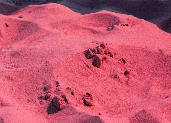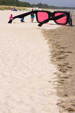 Amateurfotografen tun sich damit oft schwer. Olympus hat darauf reagiert, indem sie nicht nur ihre Kameras und Objektive zum Kennenlernen ausleihen, sondern auch von verschiedenen Künstlern Motive schaffen lassen, mit denen sich interessierte Fotografen auseinandersetzen können. In Zingst hat Olympus nun einen FotoKunstPfad mit ganz unterschiedlichen Motiven eingerichtet, die man über den Ort verteilt aufspüren muss – teils stehen sie an belebten Straßen, teils mitten im Wald, am Strand oder auf der Seebrücke. Einige sind gar nicht zu übersehen wie etwa Marc Mosers gigantische rosarote Brille „Sea Pink II“, andere wie die winzigen Figuren von Sibylle Oellerich und Katharina Göbel muss man erst einmal aufspüren. Die spiegelnden Figuren von Rob Mulholland bleiben selbst fast unsichtbar – sie erzeugen eine Instant-Montage aus zwei in unterschiedlichen Richtungen liegenden Ansichten der Umgebung. Es liegt allein am Fotografen, was er daraus macht; so kann die Riesenbrille „Sea Pink II“ als Objekt gesehen werden oder durch ihr rosarot gefärbtes Licht den Zingster Strand in eine Marslandschaft verwandeln.