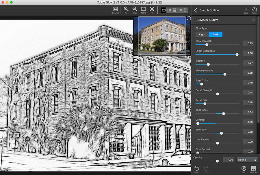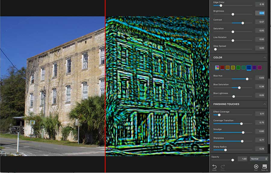 Das ist aber nur ein Teil dessen, was den Schwerpunkt dieser Software ausmacht. Der andere befasst sich mit eben diesen Kontrastgrenzen selbst und wandelt sie in schwarze oder weiße Linien um, deren Ausprägung und Erscheinungsbild Sie nach Bedarf steuern können.