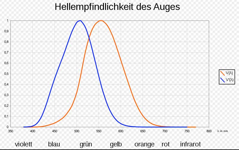 Nun gibt es aber den sogenannten Purkinje Effect, der die physiologische Erscheinung beschreibt, dass verschiedenfarbige Flächen, die bei Tageslicht als gleich hell wahrgenommen werden, bei Dämmerlicht als unterschiedlich hell gesehen werden. Dieser Effekt beruht auf den unterschiedlichen Spektralempfindlichkeiten von Zapfen und Stäbchen: Die Stäbchen reagieren besonders stark auf blaugrünes Licht!