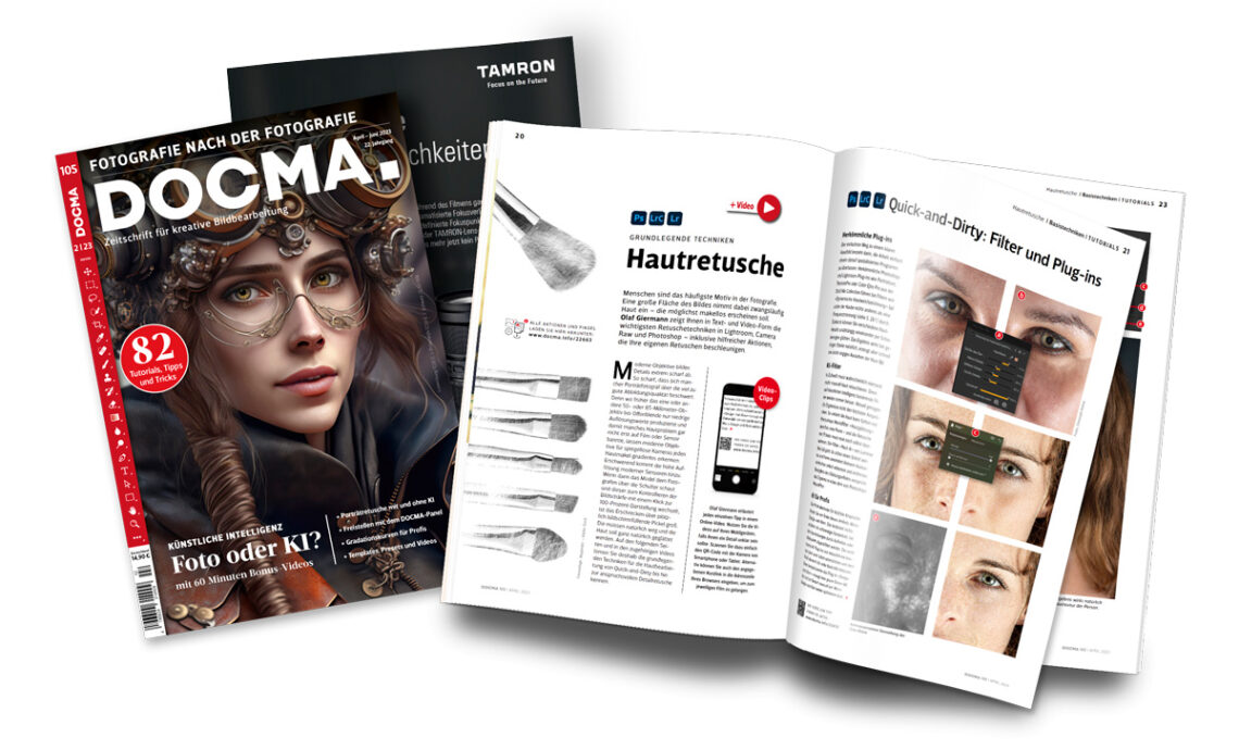 Wie immer finden Sie auch in der neuen DOCMA-Ausgabe 105 viele Tipps und Tricks sowie ausführliche Tutorials – diesmal zu Photoshop, Lightroom, Luminar Neo und Affinity Photo 2 – sowie Freeloads für Bildbearbeiter und Fotografen. In unserer Galerie zeigen wir zu Ihrer Inspiration Arbeiten der kreativsten Bildermacher.