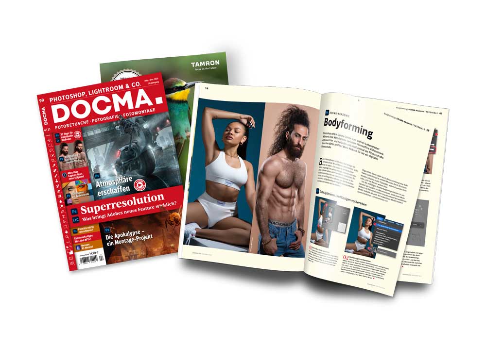 Im Premium-Workshop gibt Ihnen Olaf Giermann diesmal 30 Tipps für Looks und Bildeffekte in Lightroom, Photoshop und Affinity Photo – wie üblich ergänzt durch Video-Clips, die Sie per Weblink aufrufen können. ∎ In seiner apokalyptischen Fotomontage To bee or not to be thematisiert Olaf Giermann das Bienensterben und beschreibt die einzelnen Arbeitsschritte zum Nachvollziehen. ∎ Wie man Fotos und Montagen so bearbeitet, dass sie eine bestimmte Atmosphäre zum Ausdruck bringen, demonstriert Uli Staiger im Tutorial Atmosphäre schaffen. ∎ Merle Nicksch stellt in der Photoshop-Akademie unter dem Titel Bodyforming ihr virtuelles Fitnessstudio vor. ∎ Sigrid Aicher beschreibt die Möglichkeiten des neuen Stil-Pinsel-Werkzeugs von Capture One 21. ∎ In Visuelle Hilfsmittel zeigt Ihnen Olaf Giermann, wie Sie Hilfsebenen für Bildkorrekturen und Fotomontagen nutzen. ∎ Auch in dieser Ausgabe gibt es wieder ein Video-Tutorial von und mit Peter Braunschmid alias Brownz, der mit Presets und verschiedenen Assets ein Foto kreativ bearbeitet. ∎ In der Extended-Rubrik stellt Ihnen Olaf Giermann Adobes neues 3D-Angebot Substance 3D vor. ∎ Christoph Künne hat mit dem früheren DOCMA-Award-Teilnehmer Bernd Schirmer über seine von klassischen Gemälden inspirierten Fotomontagen gesprochen und durfte bei einer Foto-Produktion als Beobachter teilnehmen. ∎ In unserer Rubrik Tipps & Tricks finden Sie diesmal Wissenswertes zu den Speichern-Optionen von Photoshop, den Neuerungen von Affinity Photo 1.9, Luminar AI 1.3, Lightroom und Lightroom Classic sowie Instagram & Pinterest.