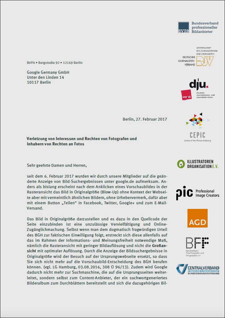 In einem offenen Brief an Google Germany kritisieren neun Verbände aus dem Bildbereich die Verletzung von Interessen und Rechten von Fotografen, Bildagenturen, Illustratoren und Grafikern durch die neue Google-Bildersuche. Sie berufen sich dabei auf mehrere einschlägige Gerichtsurteile.