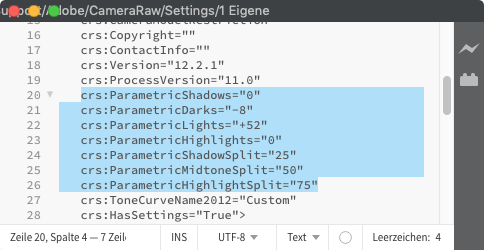 Neues von den Lightroom-Vorgaben: Wenn die parametrische Kurve nicht Teil der Vorgabe und eine bereits vorhandene parametrische Kurve bei Anwendung der Vorgabe erhalten bleiben soll, löschen Sie einfach die entsprechenden Zeilen in der Vorgabendatei.