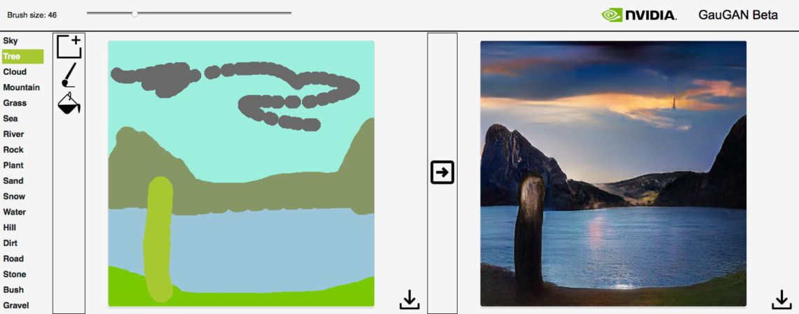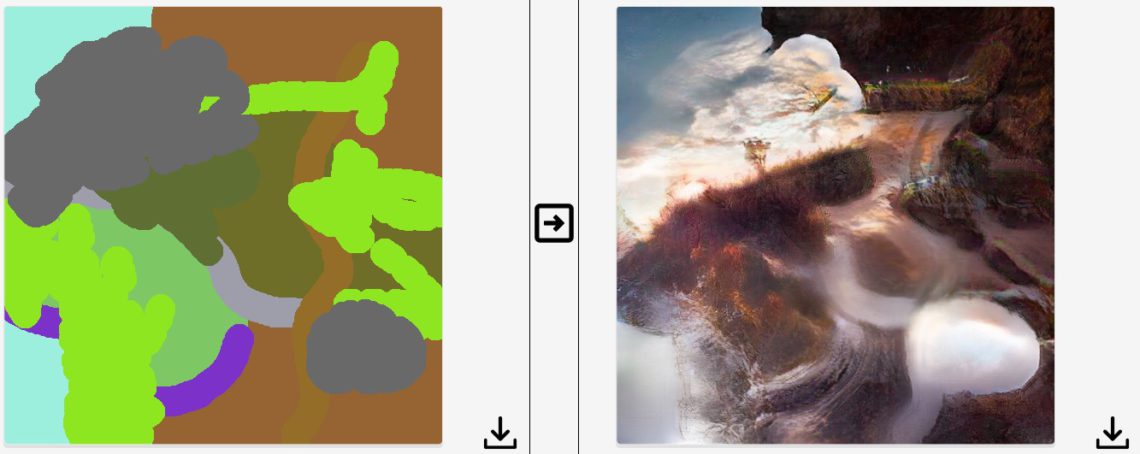 NVIDIA GauGan: Mit einfachen Pinselstrichen skizzieren Sie die gewünschten Elemente im linken Fenster. Wenn Sie auf den Pfeil ind er MItte klicken, wird aus Ihrer Skizze GAN-basiert das Bild im rechten Fenster generiert. Obwohl das Fenster gering und die „Montage-qualität“ (noch!) gering ist: Beeindruckend, oder?NVIDIA GauGan: Jeder weitere Pinselstrich verändert das generierte Bild – umsomehr, wenn Sie neue Element-Arten hinzufügen, also Büsche, Felsen, Wege und so weiter. Jetzt schon eine kreative Spielwiese zur Ideen-Findung!NVIDIA GauGan: Falls Ihr Landschaften und nicht einfach irgendwelche mehr oder weniger kreativen Texturkombinationen wie hier erzeugen wollt, solltet Ihr etwas gesunden Menschenverstand walten lassen: Also zumindest halbwegs versuchen, einen Horizont zu erzeugen, die Wuchsrichtung von Bäumen und die Position von Wolken richtig hinzubekommen. 😉