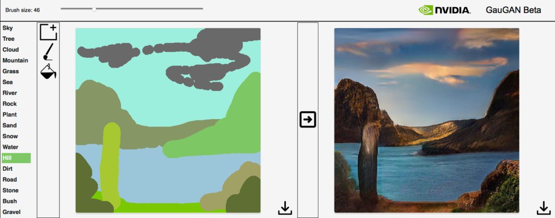Im März fragte ich angesichts der NVIDIA-TechDemo noch, ob die GAN-basierte Bilderzeugung die Zukunft des Compositings sein könnte. Jetzt könnt Ihr NVIDIA GauGan bereits selbst einmal in Eurem Internet-Browser auf dem Desktop ausprobieren (auf meinem iPad funktioniert das in keinem Browser, was wohl der durch iOS beschränkten Touch-Steuerung geschuldet ist). Infos findet Ihr unter diesem Link: Live Interactive Demos. Dort einfach auf „Launch interactive Demo“ klicken und direkt losmalen!