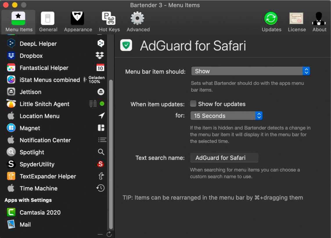 Abhilfe schafft hier ein Management-Tool, mit dem man Icons selektiv bei Bedarf und je nach Anwendungsszenario ein- und ausblenden kann. Dafür gibt es kostenlose Programme wie zum Beispiel Broomstick. Ich hab mich nach verschiedenen Vergleichen aber für Bartender entschieden, das kaum Anpassungs- und Konfigurationswünsche frei lässt – dadurch aber auch deutlich komplexer ist. Kann ich nur empfehlen. Vor allem beim Screenrecording ist es für mich ein Segen, alle Symbole, die Uhr und das Datum einfach mit einem Klick oder Shortcut ausblenden zu können – während einzelnen Programme weiterhin bei Bedarf erlaubt werden kann, ihre Icons in der Menüleiste zu zeigen. Empfehlung!